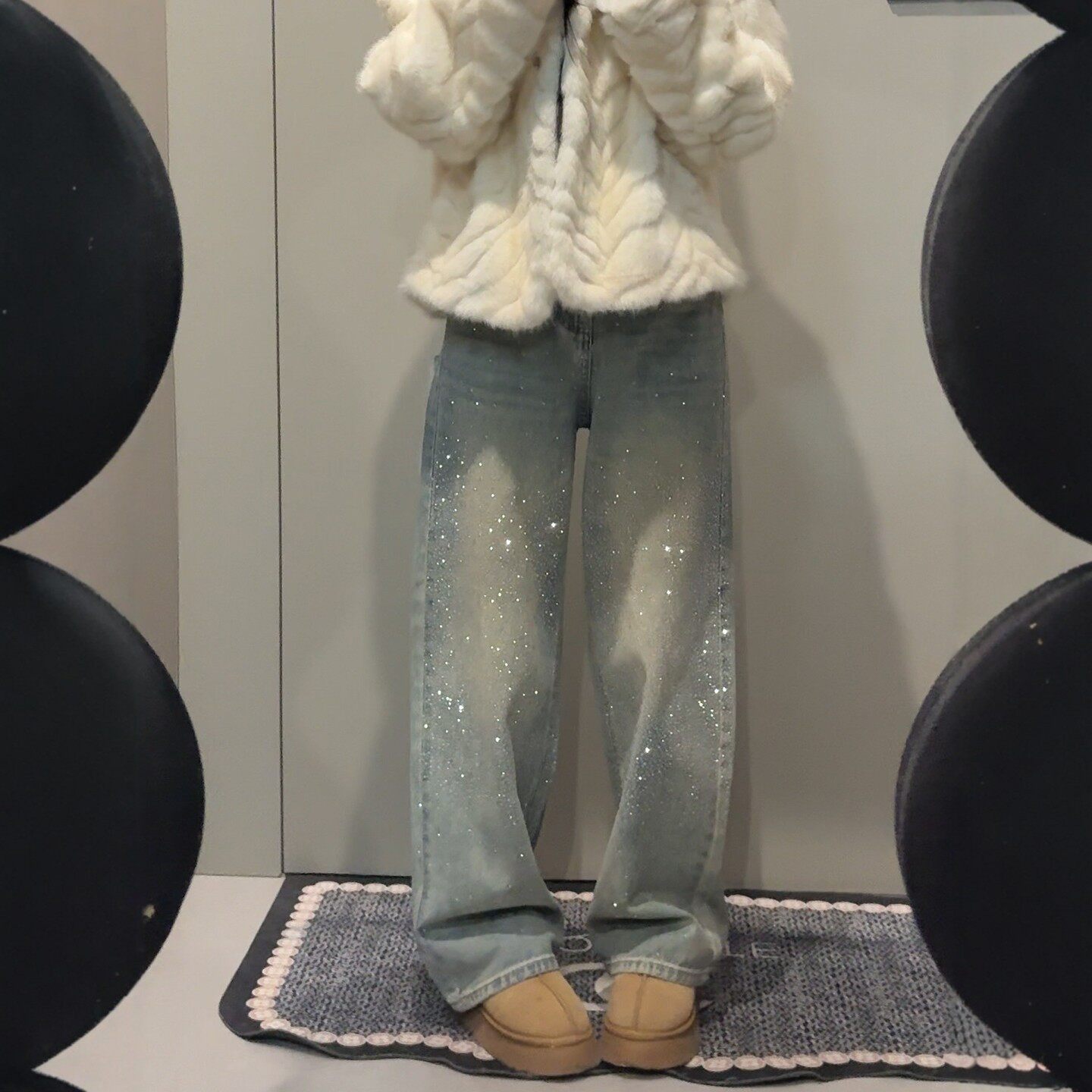 复古满天星烫钻阔腿牛仔裤女秋冬大码胖mm高腰宽松显瘦加绒直筒裤