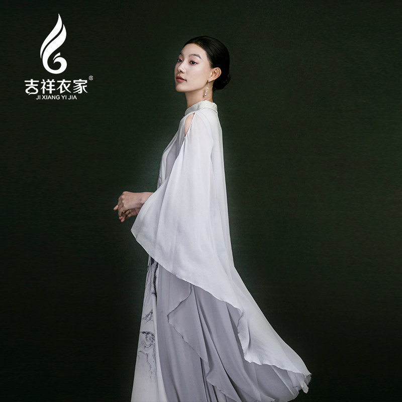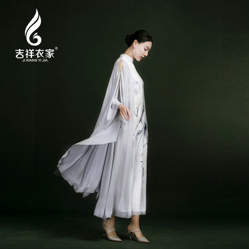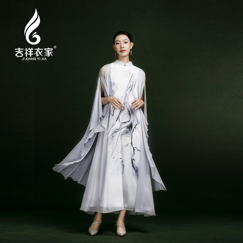 吉祥衣家轻薄真丝复古新中式国风水墨画气质女装素水流淌连衣裙