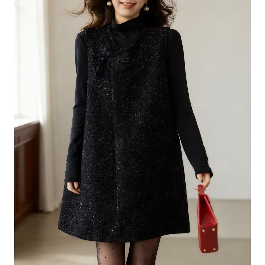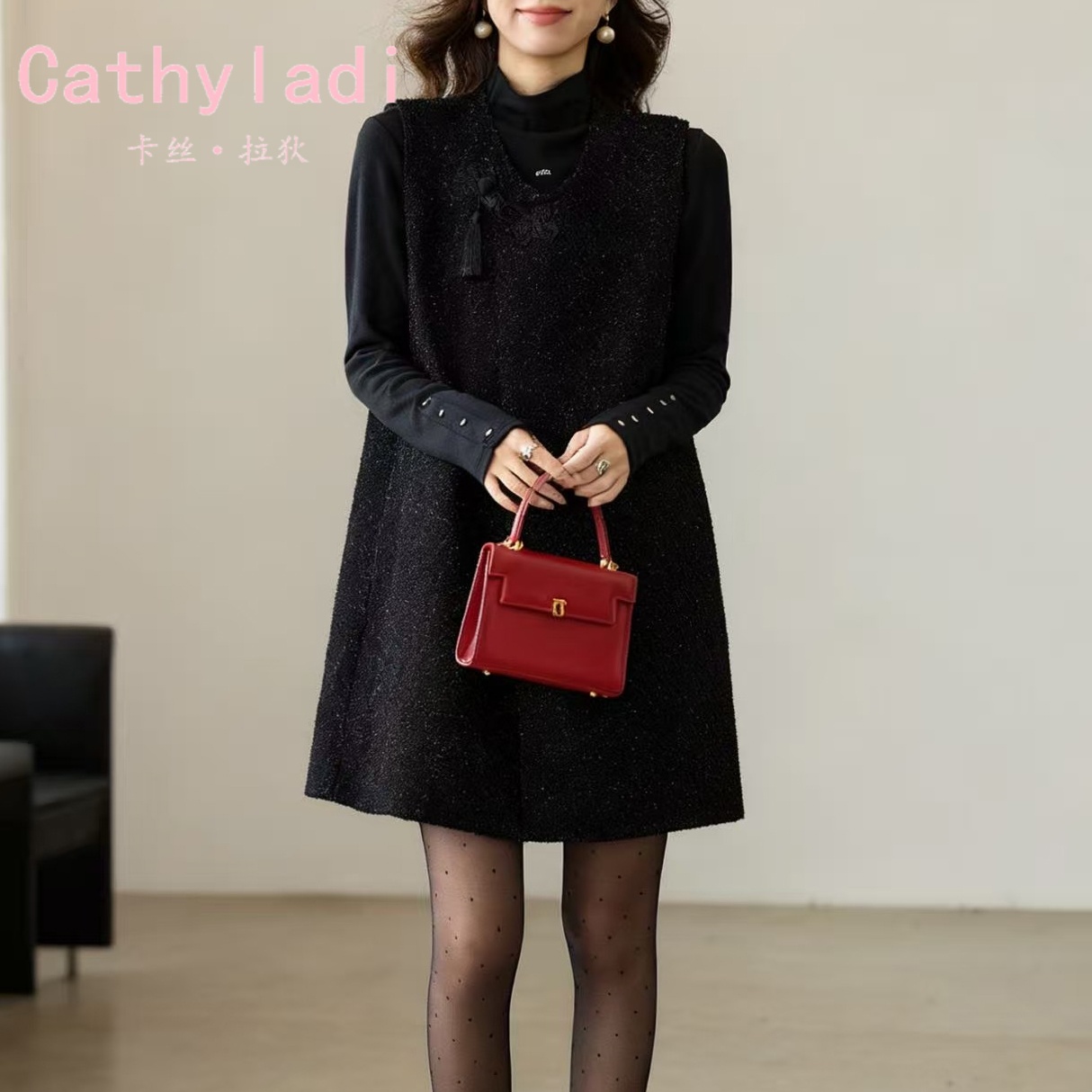 CATHYLADI新中式时尚黑色背心裙2025年冬季国风气质中长款连衣裙