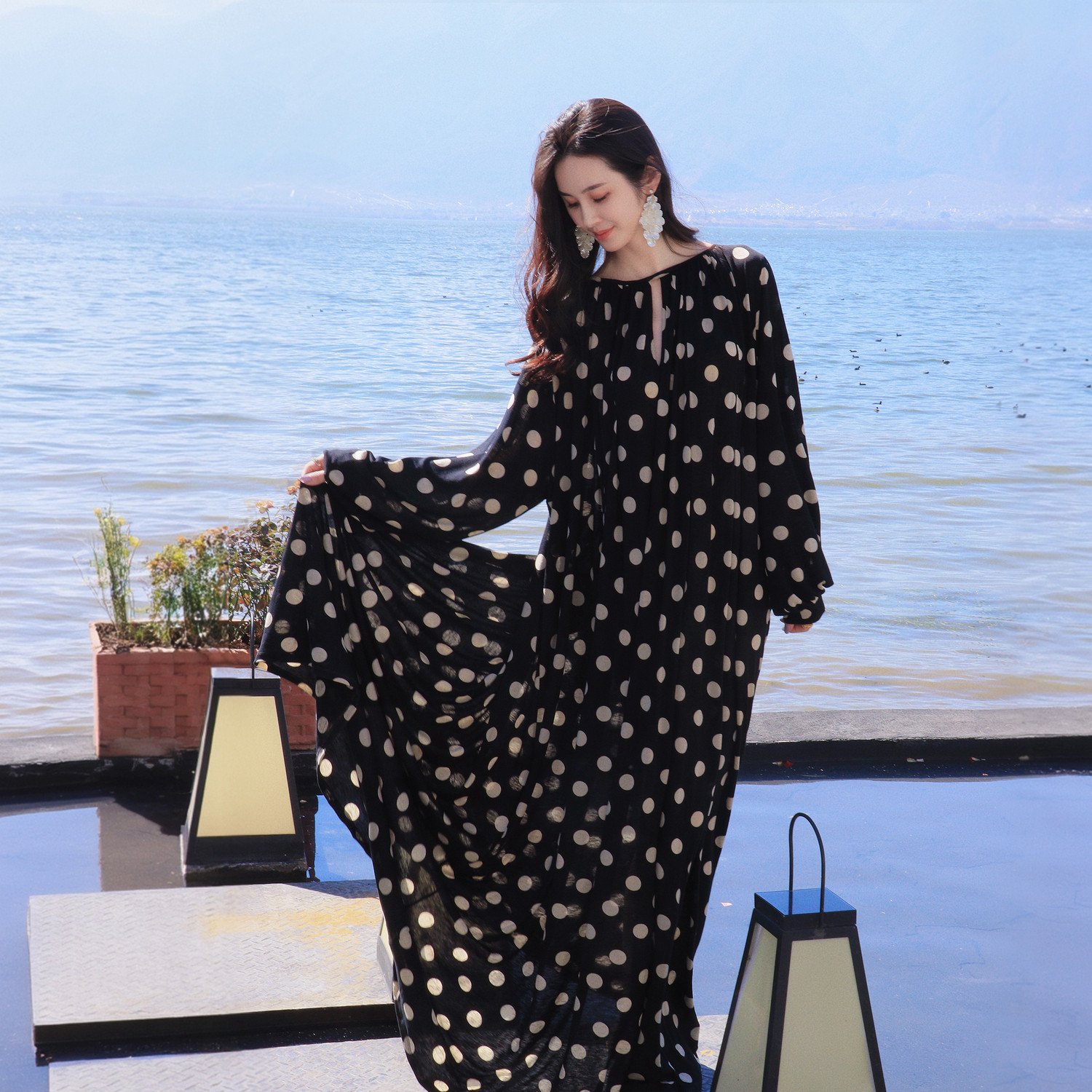 TU浮迹 莫代尔真丝圆领连衣裙2026年春季新款宽松A字褶皱长裙子