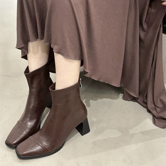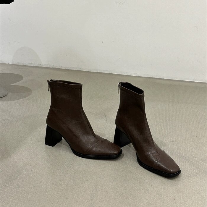 GUOLI复古气质棕色方头粗跟短靴韩版百搭弹力软皮瘦瘦靴及裸靴女