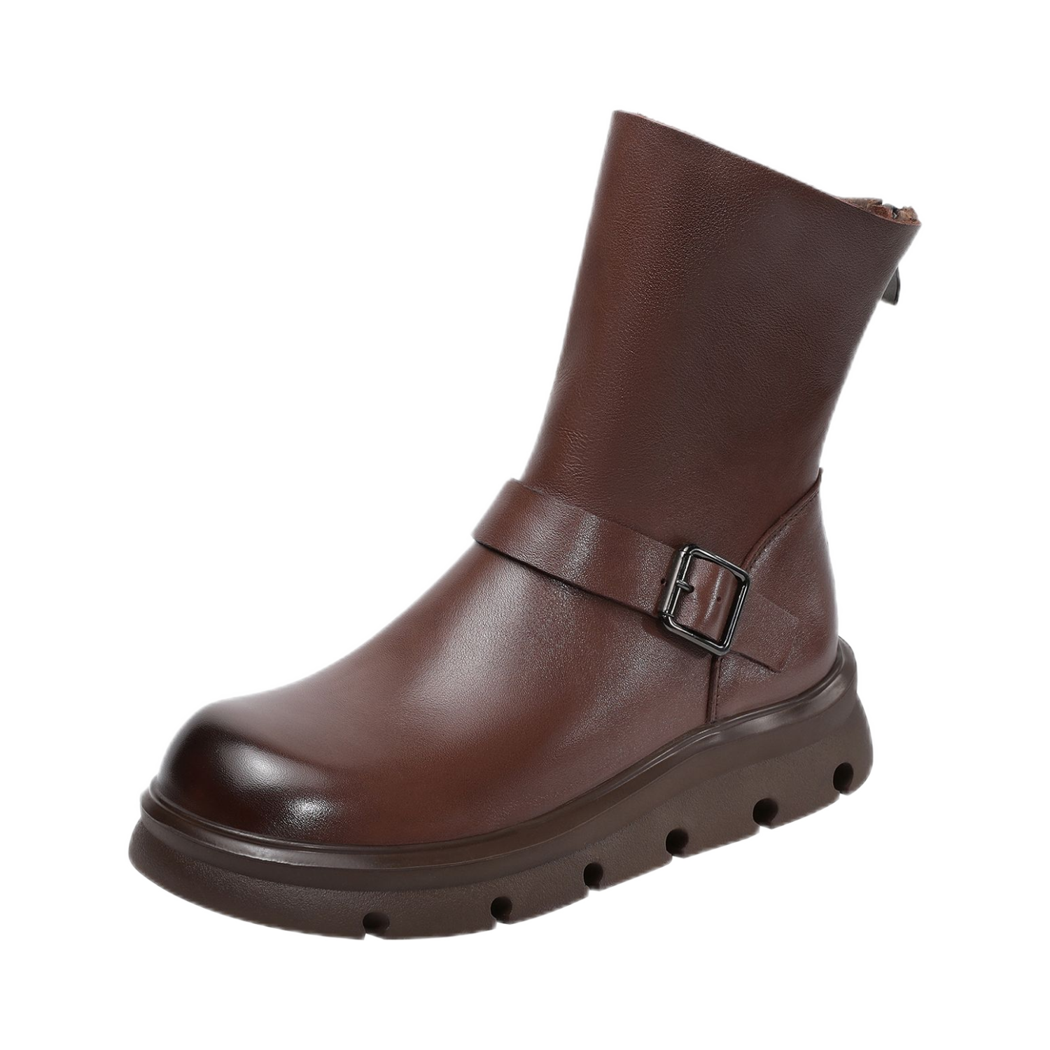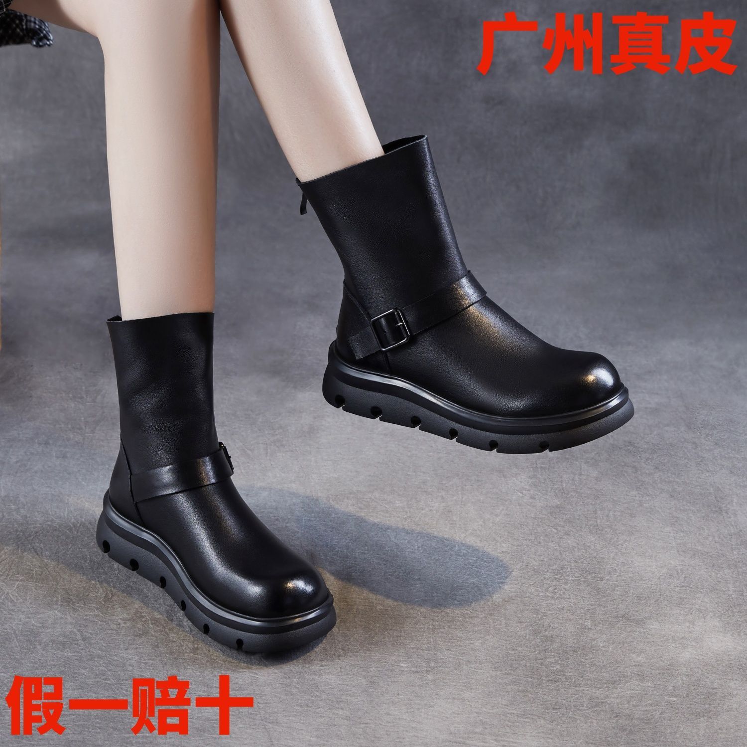 真皮厚底短靴女2025新款秋冬复古中筒马丁靴牛皮单靴后拉链倒靴子