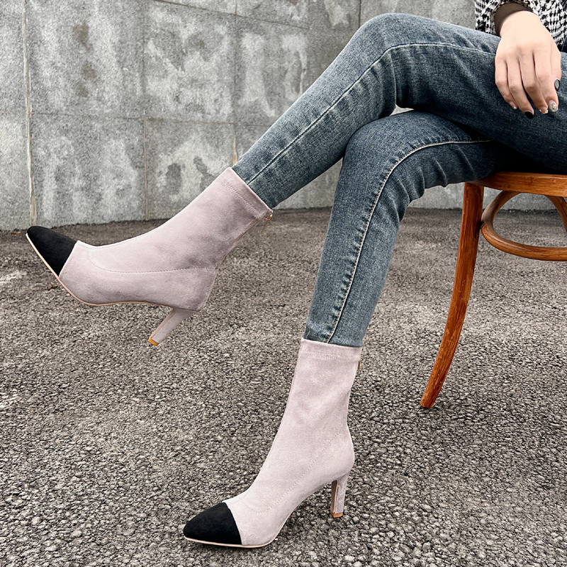 细跟短靴女拼色尖头单靴子jazz爵士舞蹈跳舞高跟鞋大码中筒弹力靴
