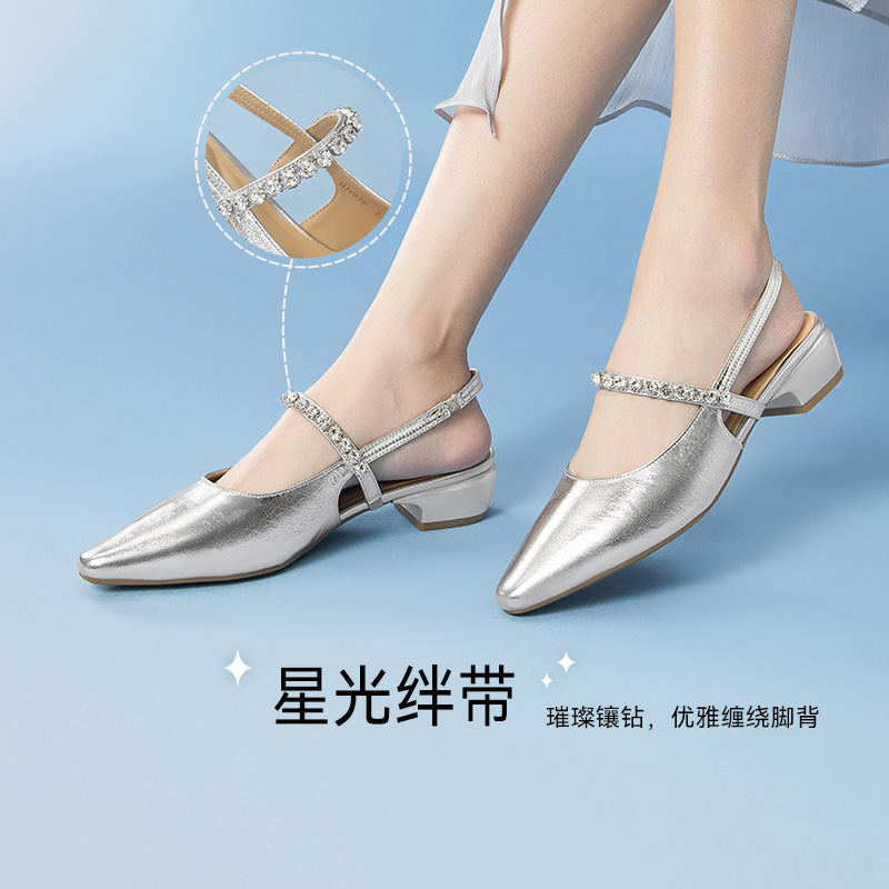 百思图2025夏季新款时尚潮流通勤尖头粗跟后空女凉鞋BN956BH5