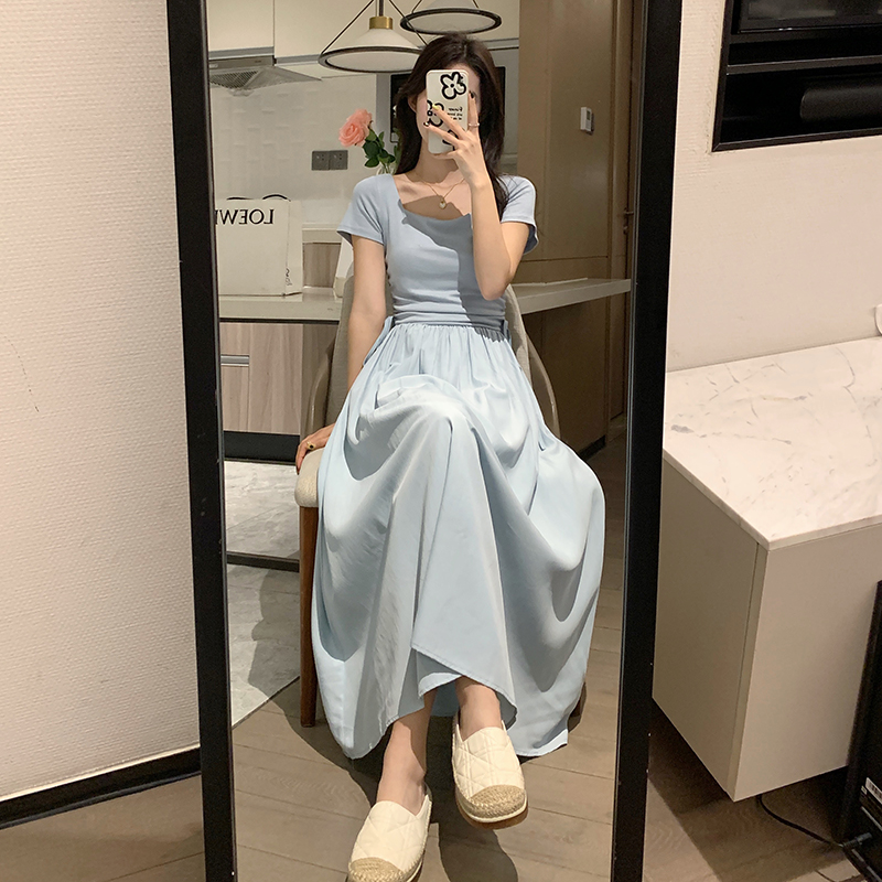 145小个子轻芭蕾方领连衣裙女夏150cm法式显高抽绳收腰A字长裙xs