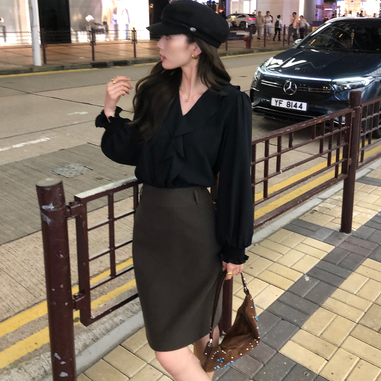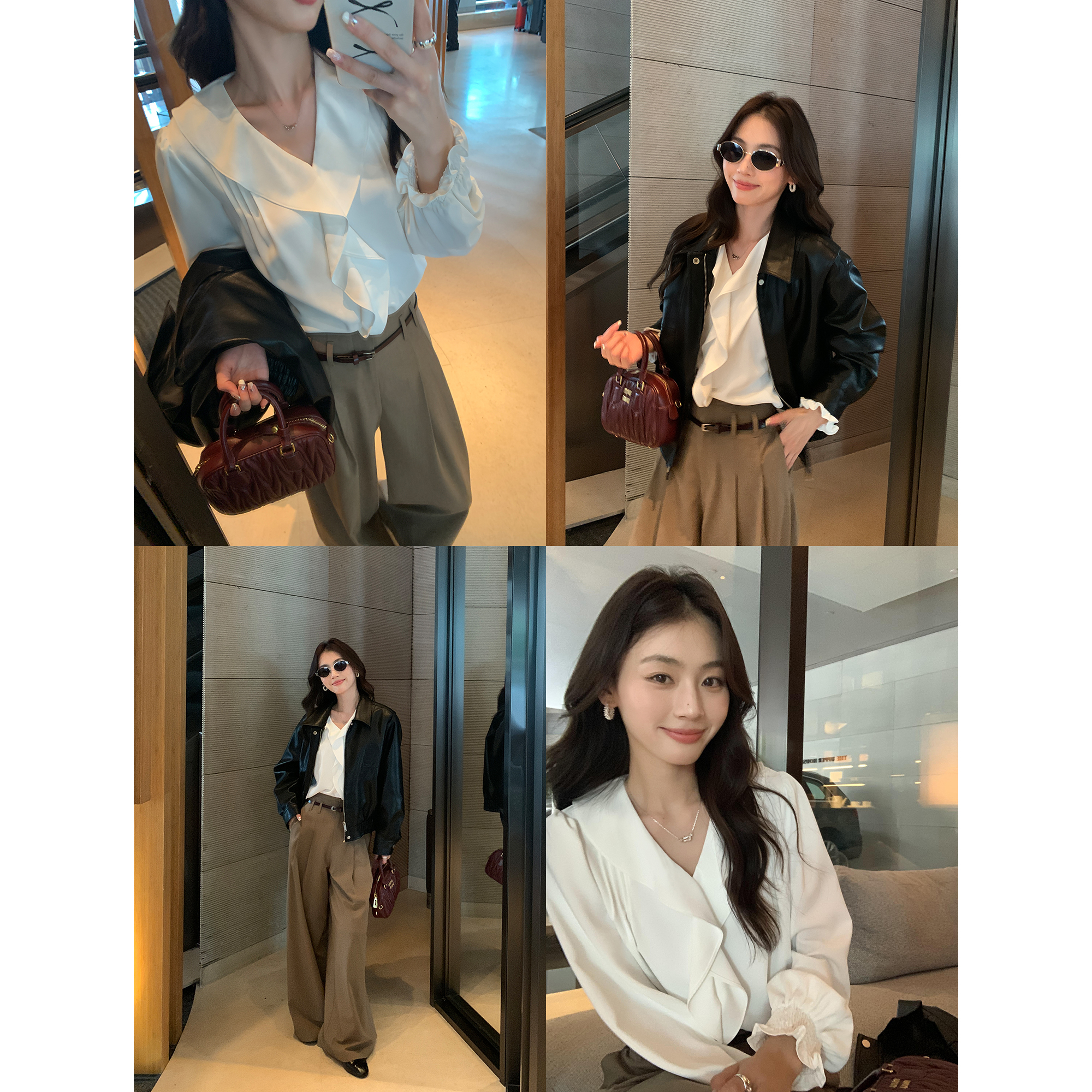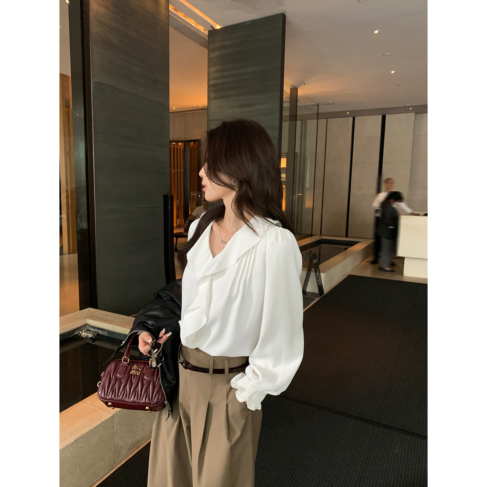 pusumede 小艺术家 设计感法式V领长袖衬衫女宽松荷叶边气质上衣