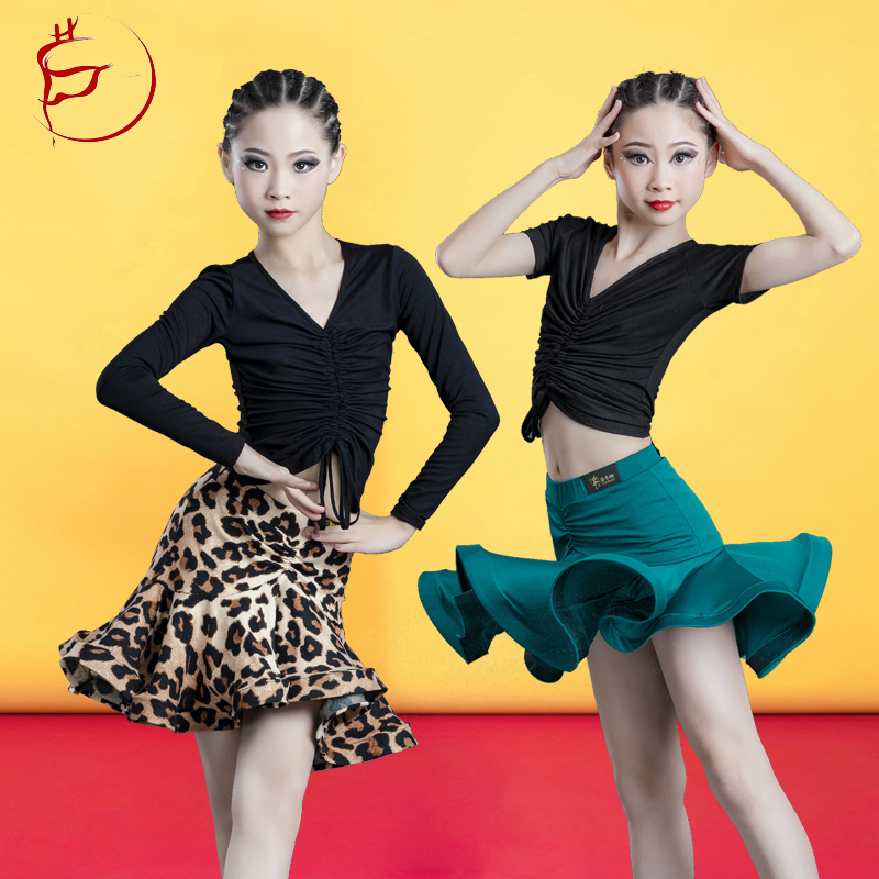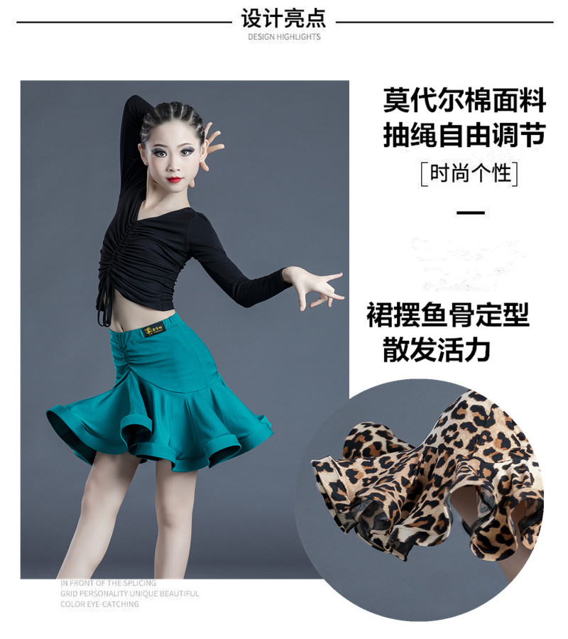 拉丁舞蹈练功服女童豹纹裙莫代尔上衣长短袖儿童表演少儿专业比赛
