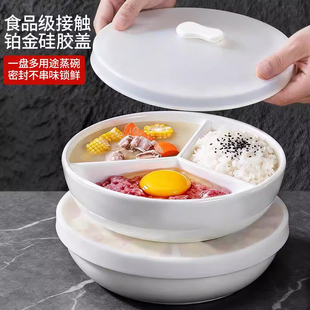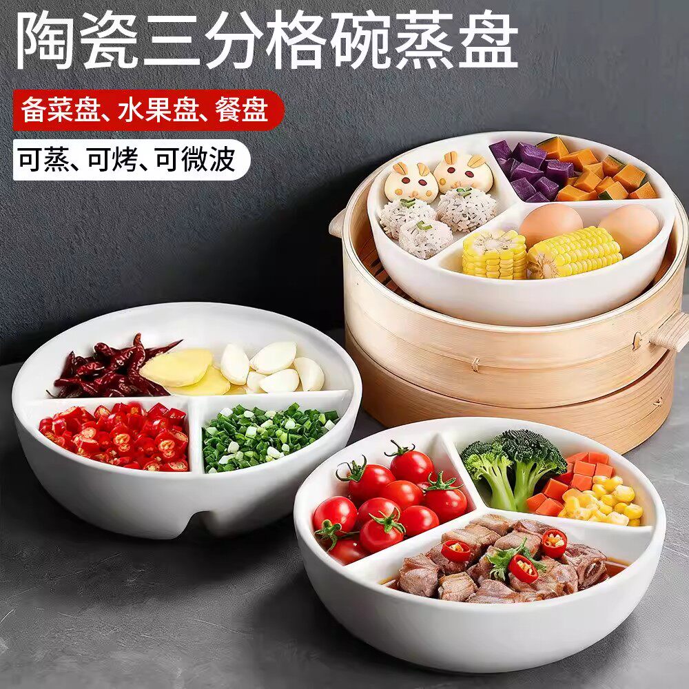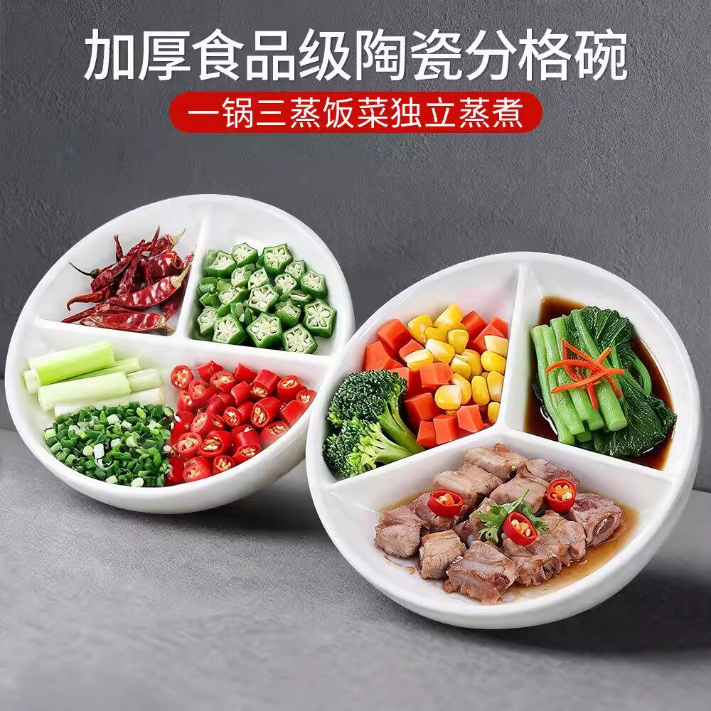 陶瓷三分格蒸盘三格陶瓷蒸碗一锅三蒸蒸蛋碗家用蒸笼蒸格盘子分隔