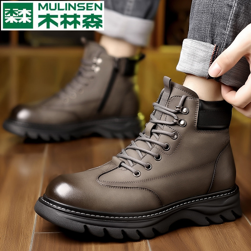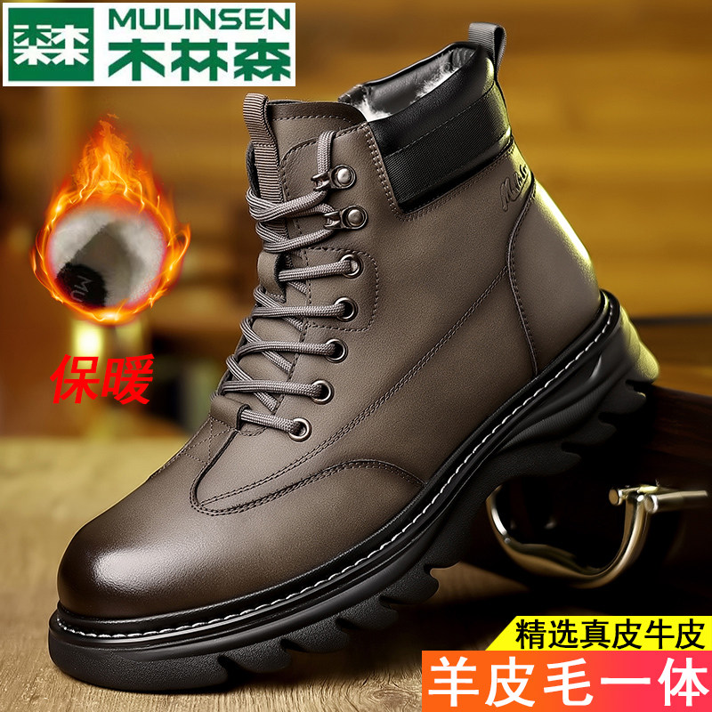 木林森冬季棉鞋加绒保暖真皮男款马丁靴户外休闲中帮东北雪地靴