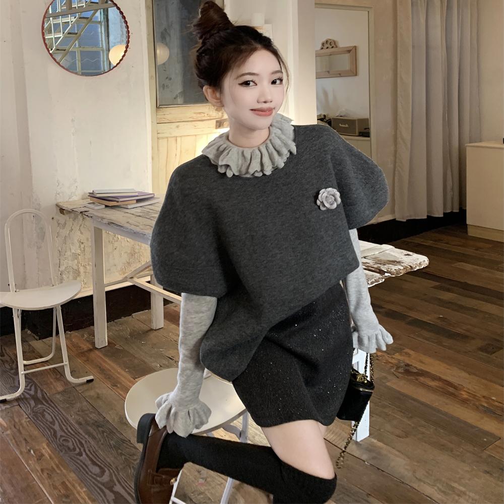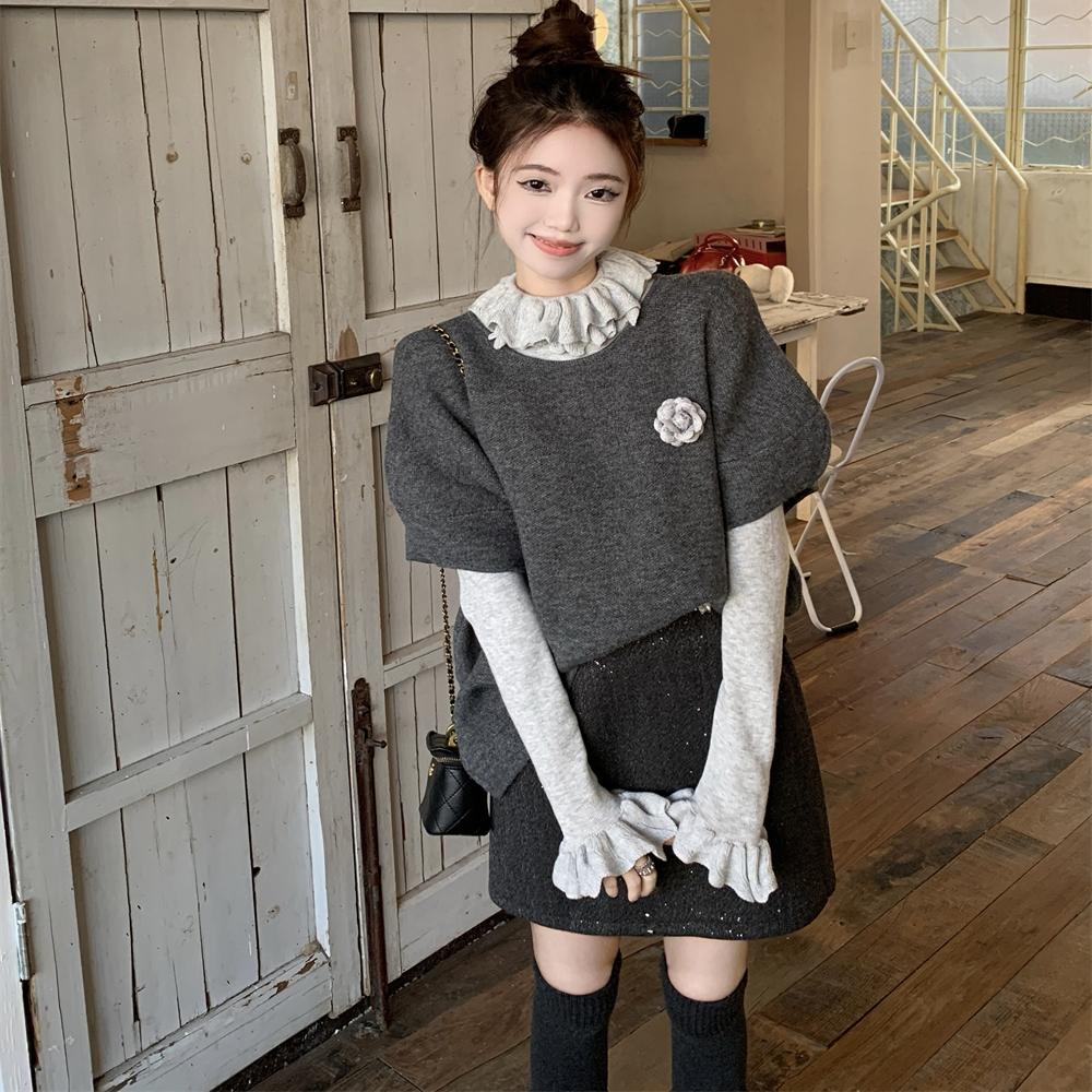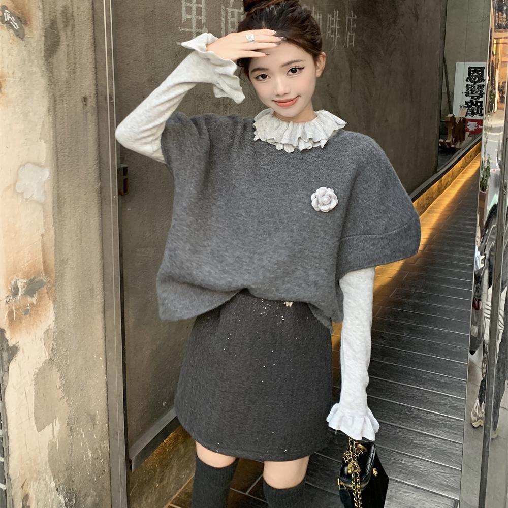 时尚套装立体花朵针织毛衣女春季内搭木耳边打底衫法式气质两件套
