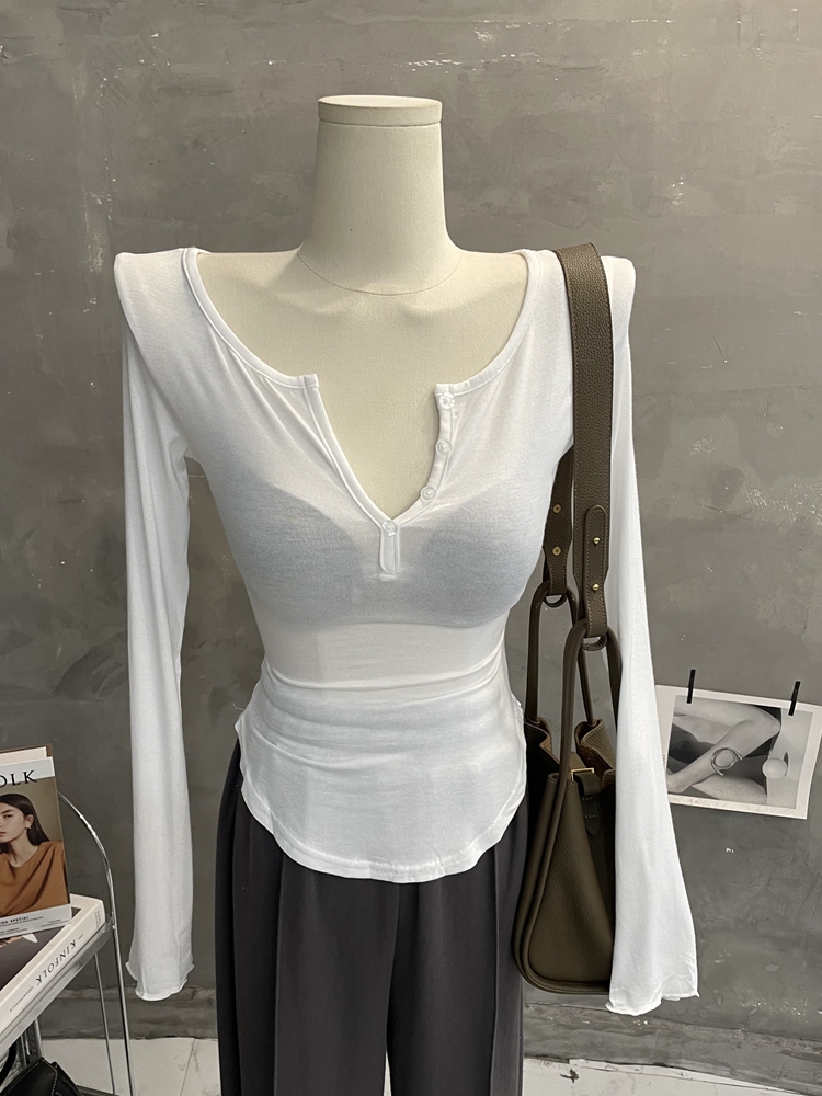 纯欲风~辣妹性感薄款长袖T恤女不规则紧身上衣收腰修身打底2023