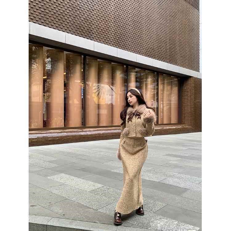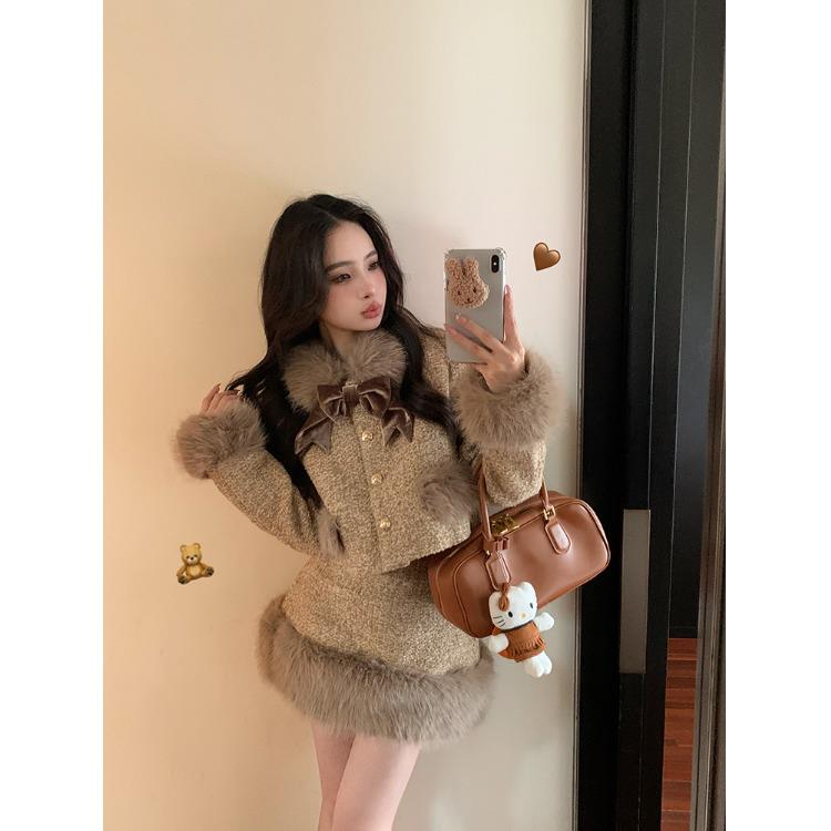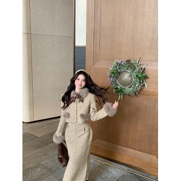 复古毛领夹棉长袖外套小香风套装女秋冬高腰a字包臀半身裙两件套