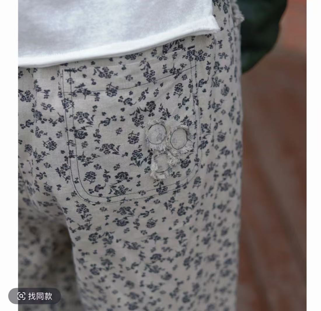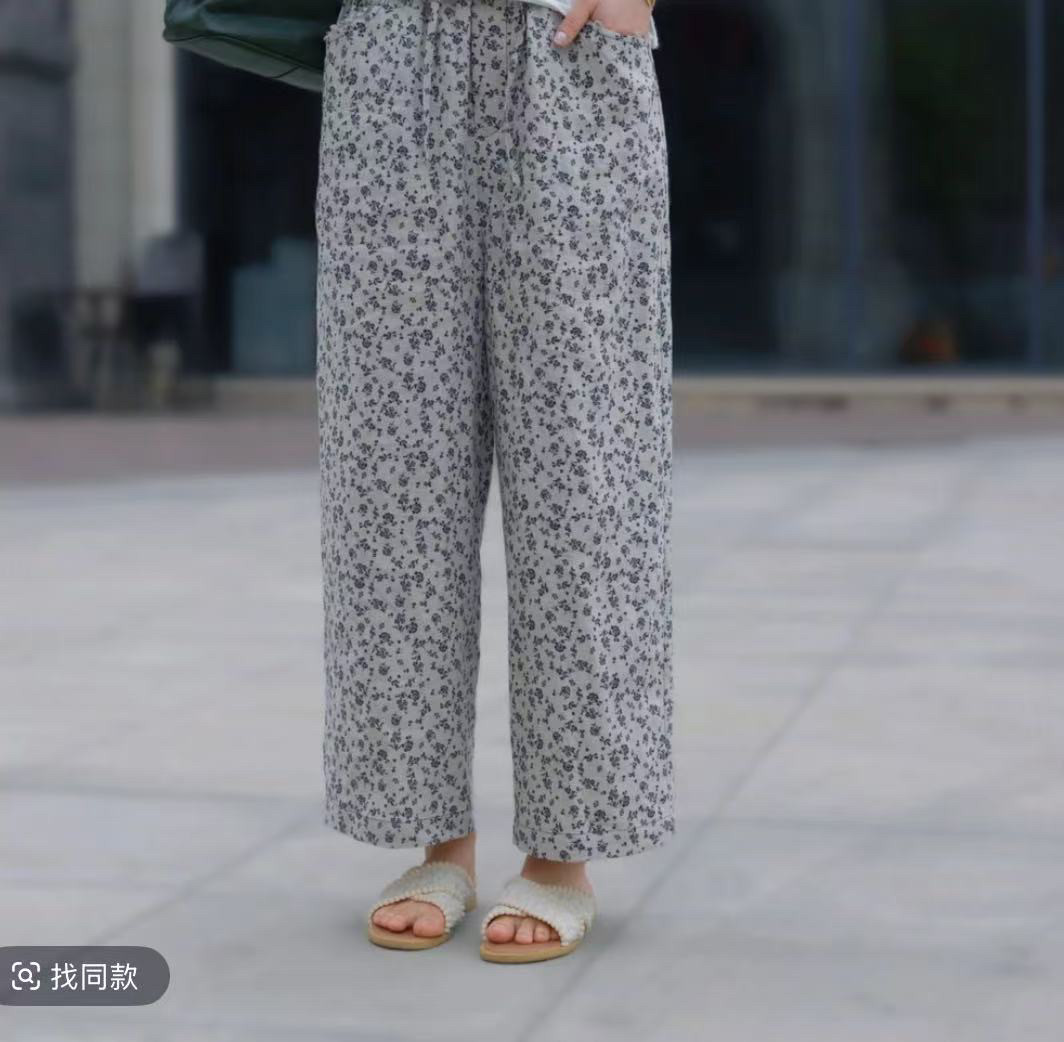早春新品14支亚麻雨露麻印花文艺休闲清凉显瘦九分阔腿小花裤2573