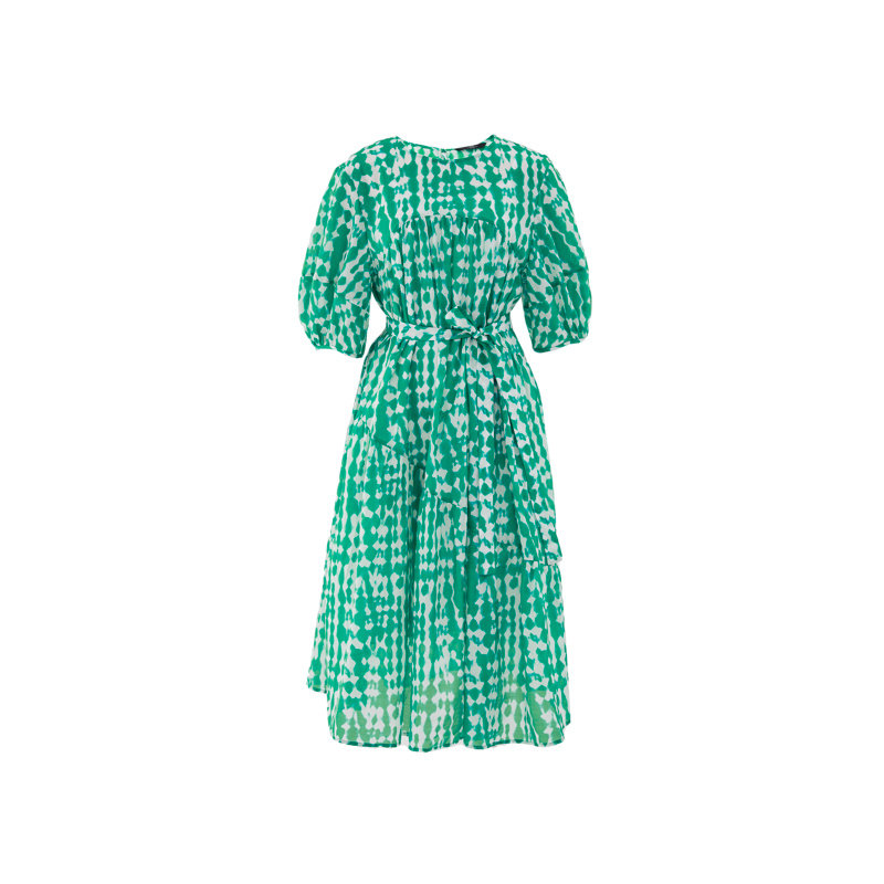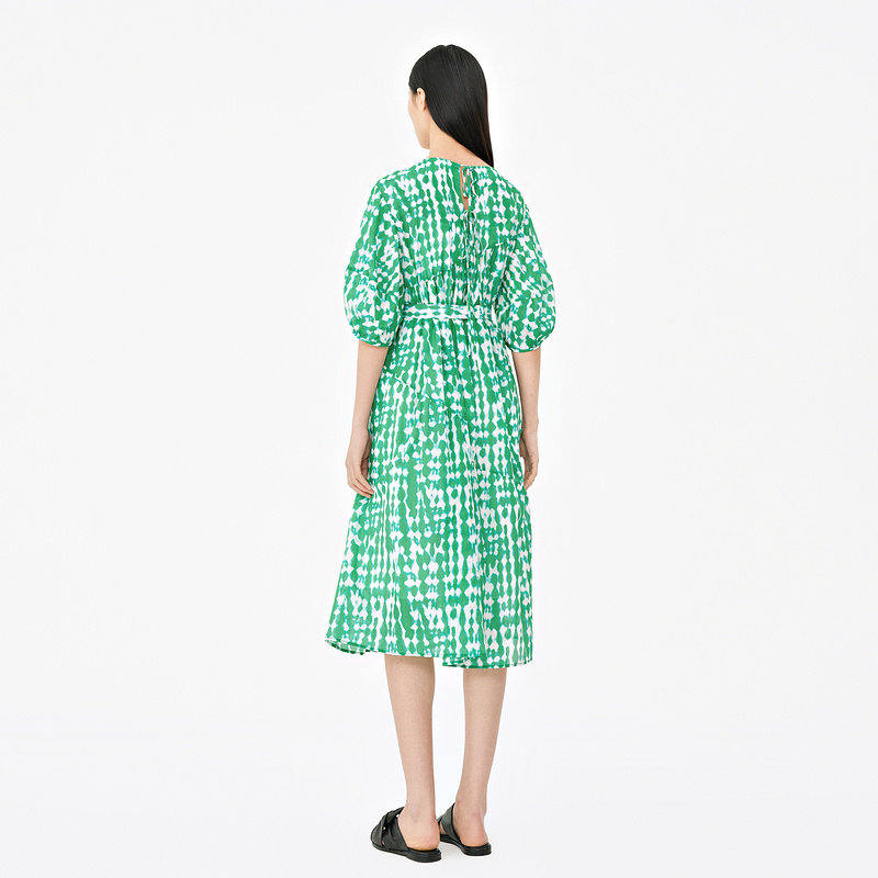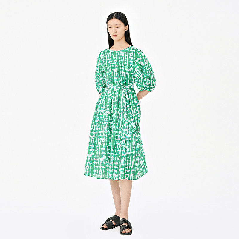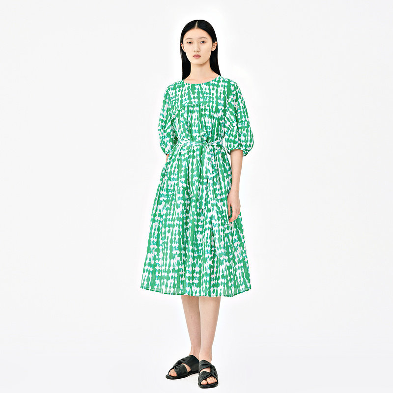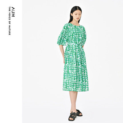 AUM噢姆夏季系带收腰中长款艺术印花连衣裙女