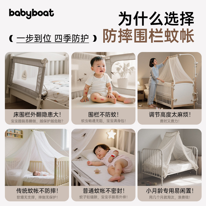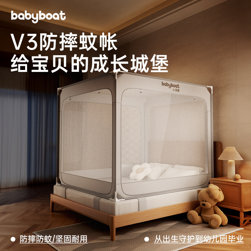 babyboat贝舟V3儿童防摔蚊帐婴儿防止掉床全底全包型全罩式围栏