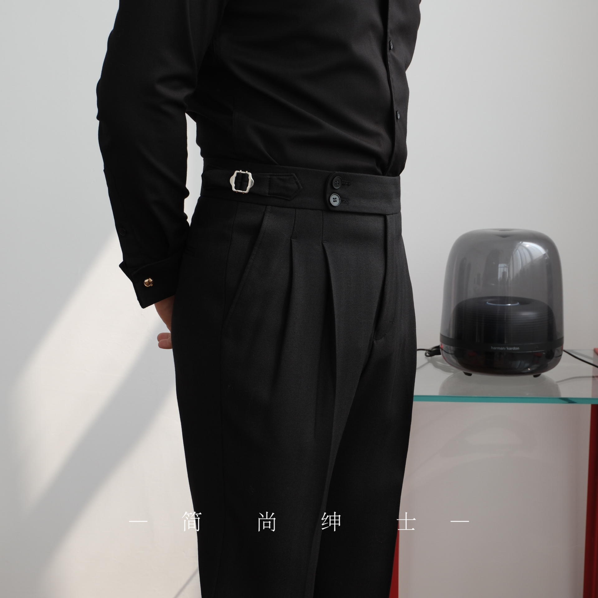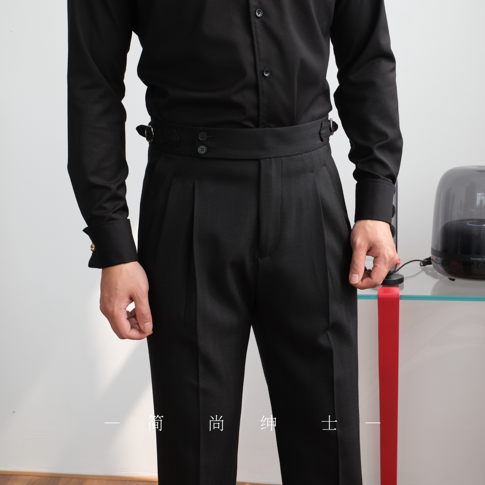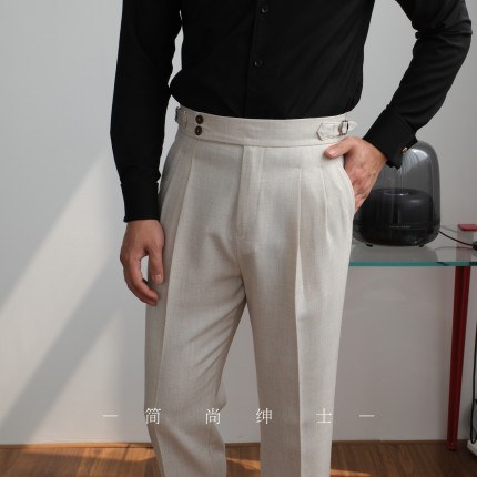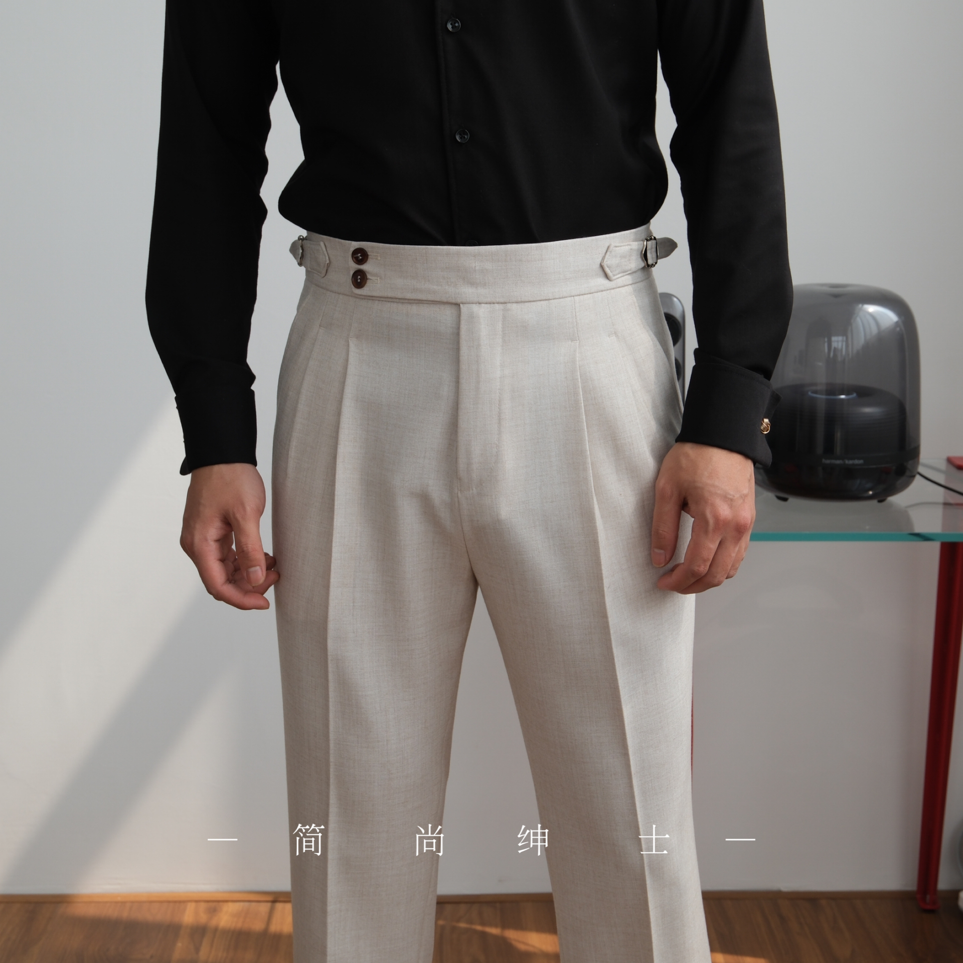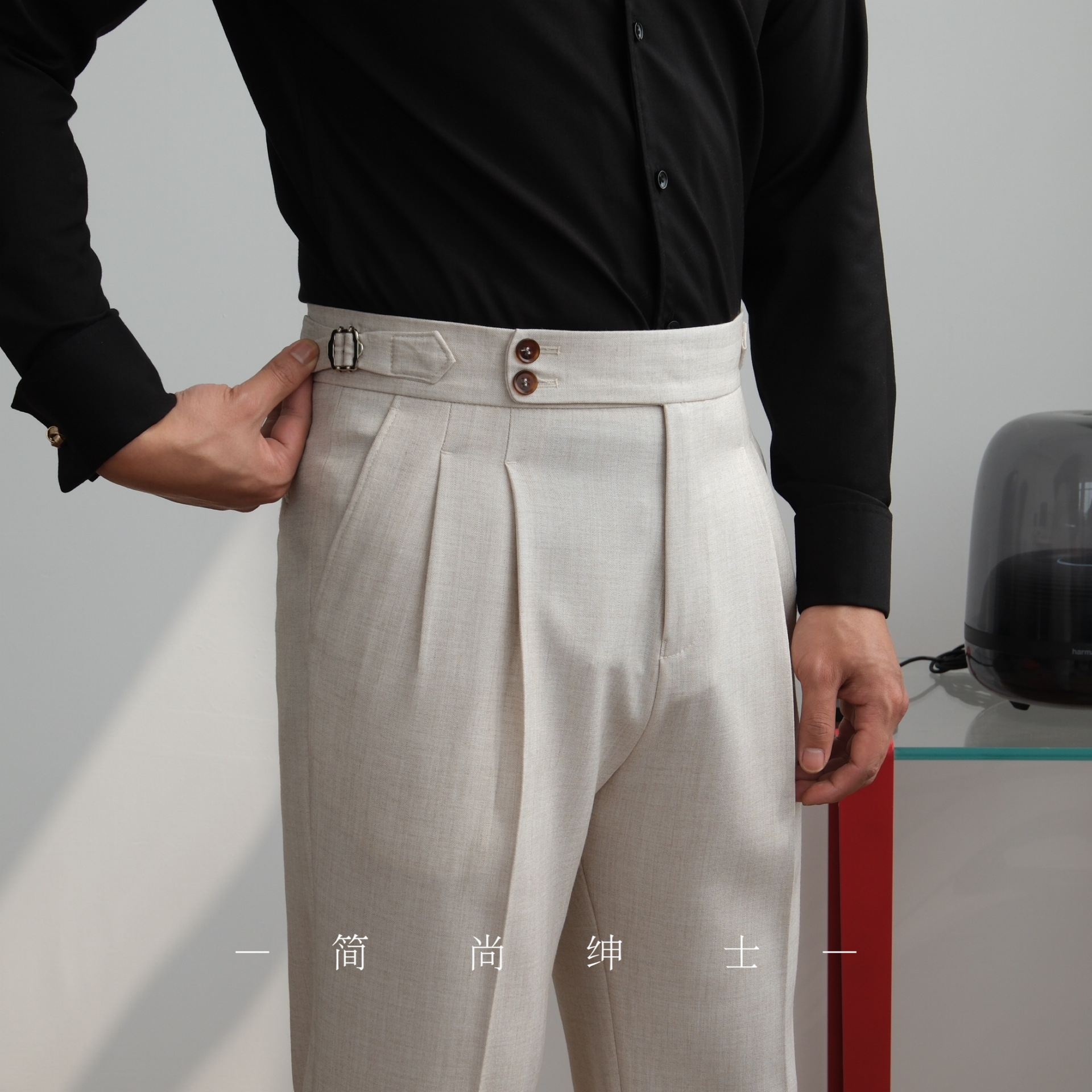 春季新款意式那不勒斯休闲西裤男士纽扣设计修身商务直筒高腰长裤