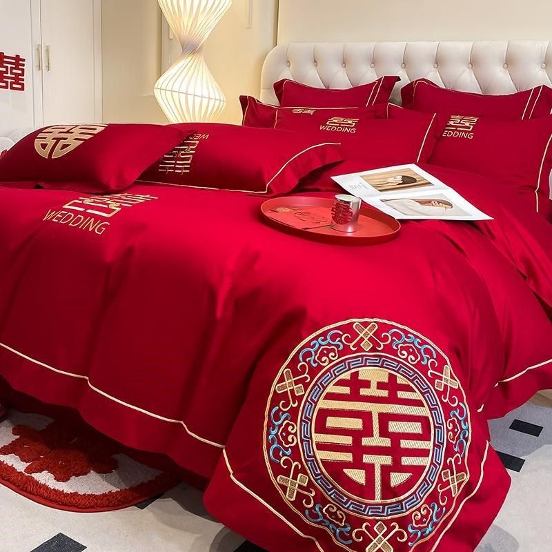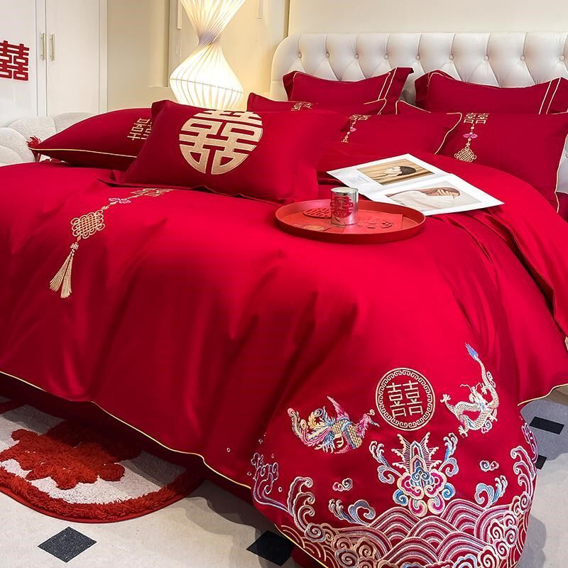 中式100支结婚四件套红色婚庆被套G婚房喜被床单陪嫁床上用品4
