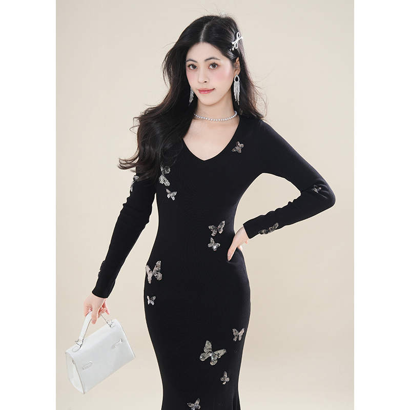 蝶梦织影 法式气质亮片修身鱼尾针织连衣裙女春秋款显瘦打底长裙