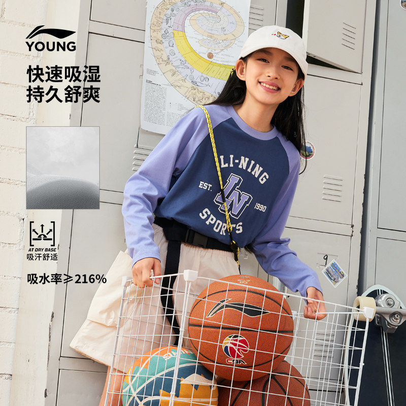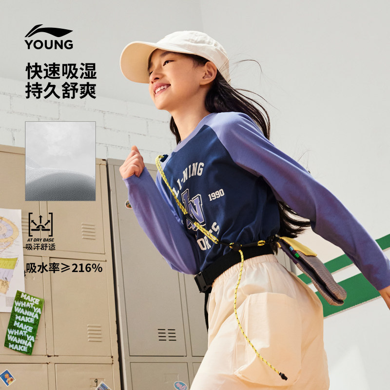 李宁小女孩速干衣长袖T恤男孩上衣春季女童装男中大童青少年春装