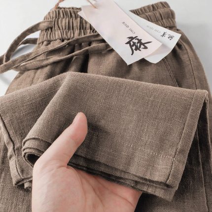 禅意风天然苎麻棉直筒休闲裤男夏季卡其色轻薄透气高腰垂感亚麻裤