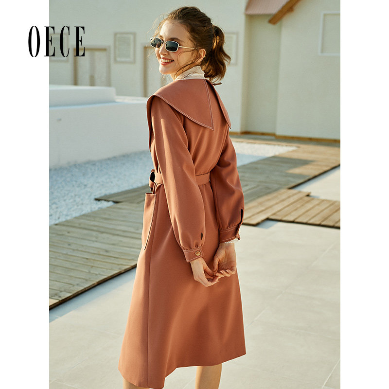 Oece春装新款女装 甜蜜英伦起范复古大翻领优雅长款风衣外套