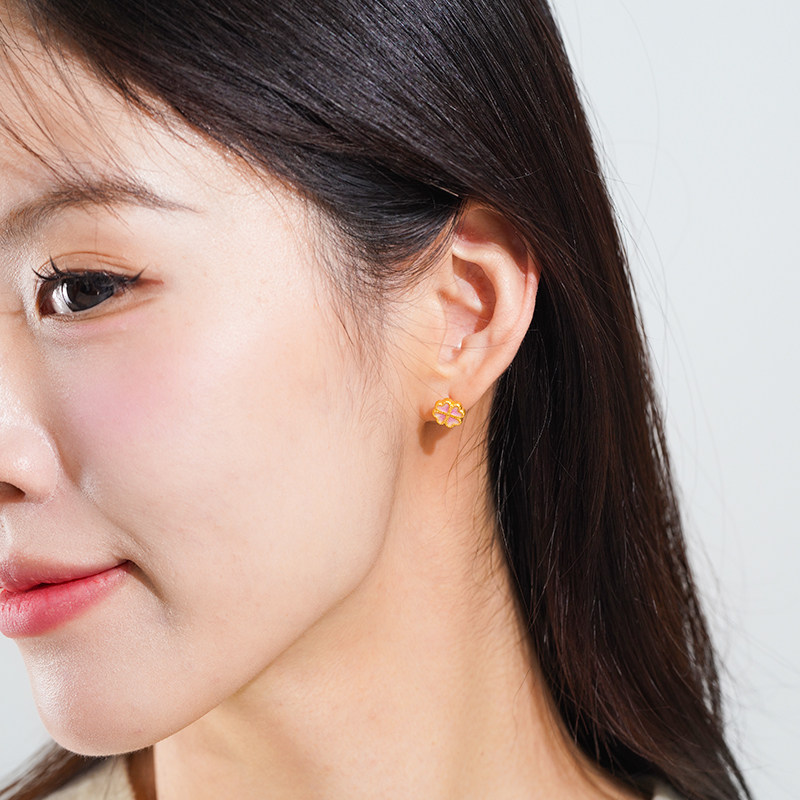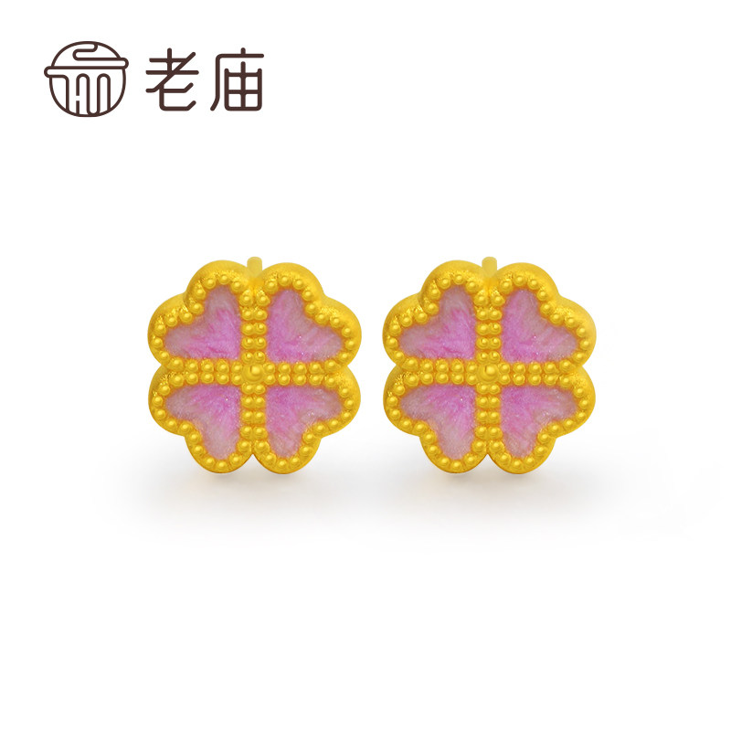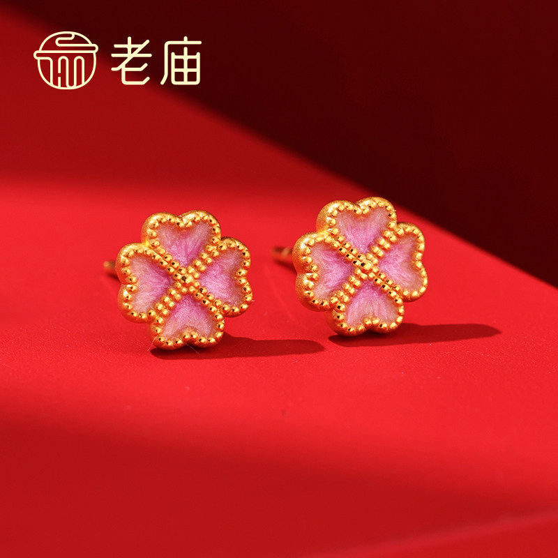 老庙黄金足金爱心四叶草鎏彩耳钉3D硬金时尚精致耳畔点缀气质显白