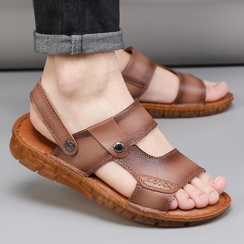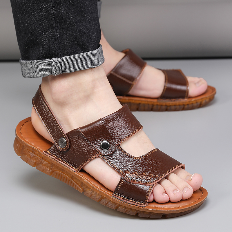 2022年新款夏季头层牛皮男士休闲露趾沙滩鞋耐磨牛筋底凉拖鞋男鞋