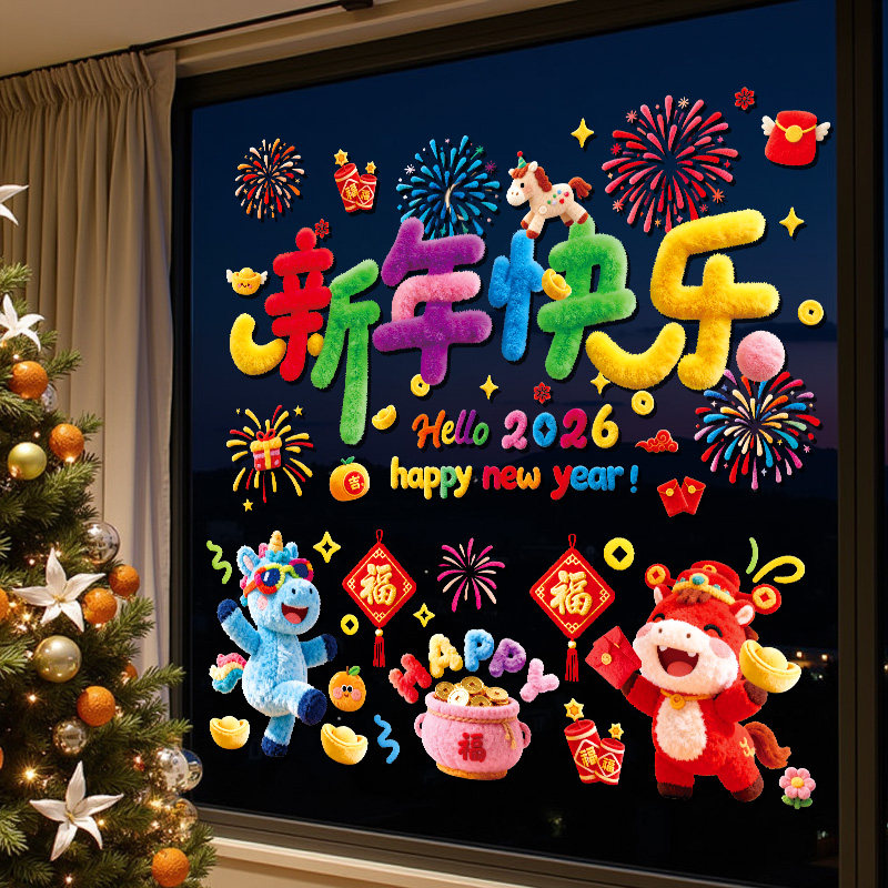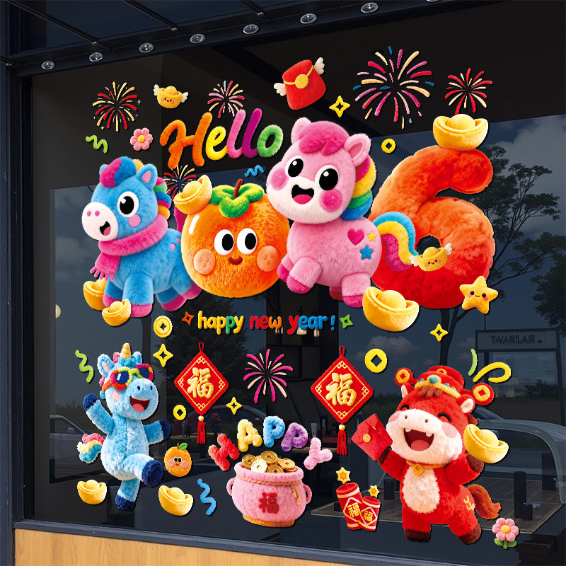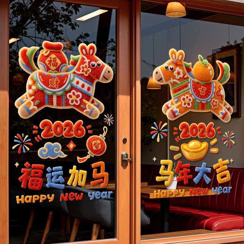 2026新年玻璃门贴纸毛绒马年装饰静电贴春节过年家用窗户窗花贴画