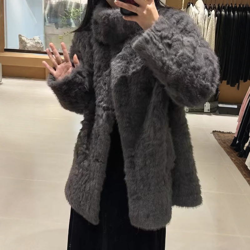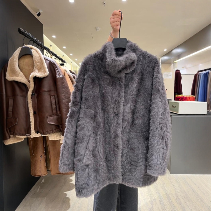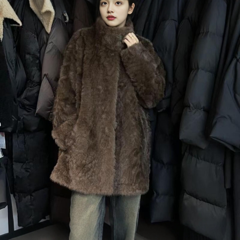 欧洲站冬季时尚百搭立领环保仿皮草外套女御寒保暖毛绒绒宽松大衣