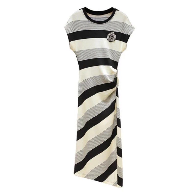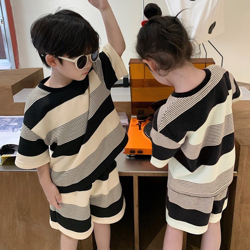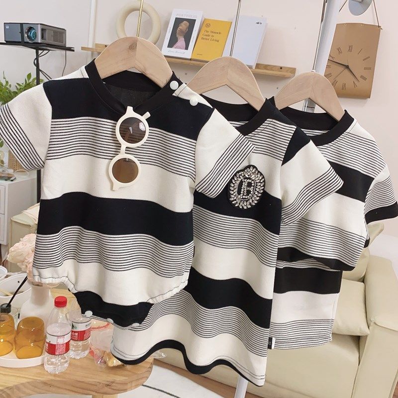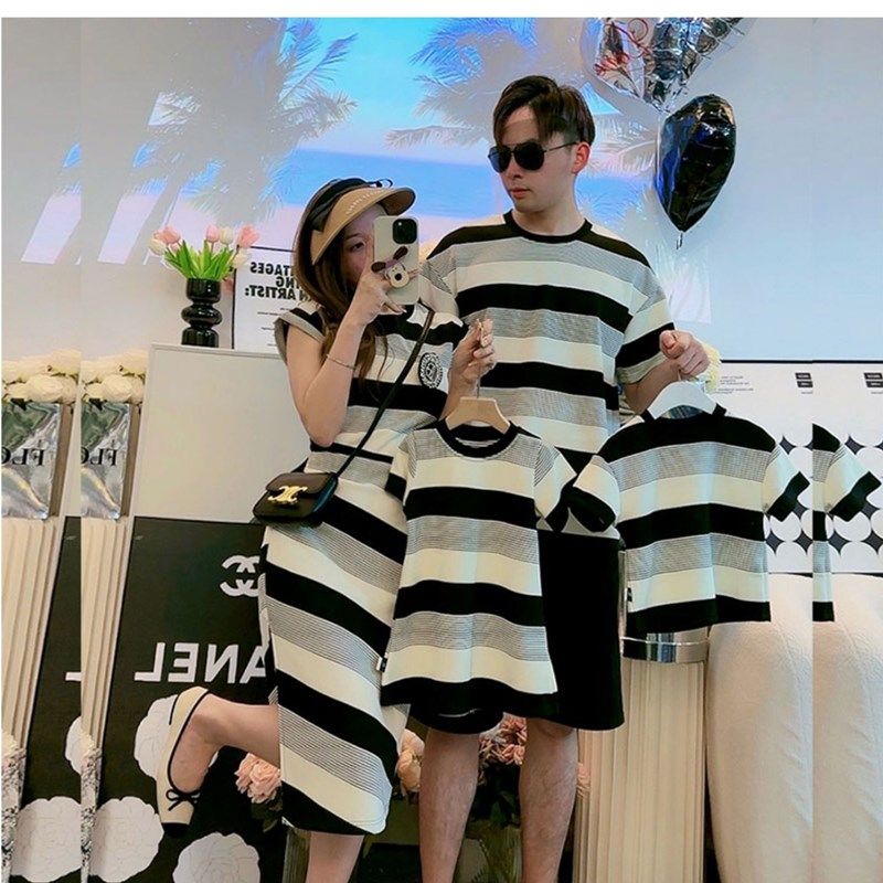 高端亲子装夏韩版条纹母女连衣裙短袖一H家三四口t恤婴儿爬服半T