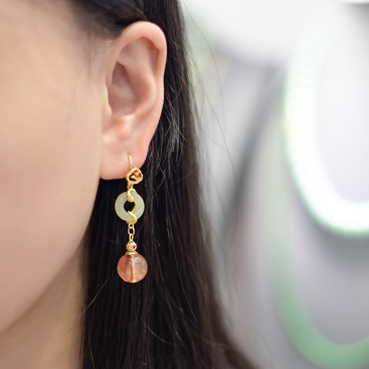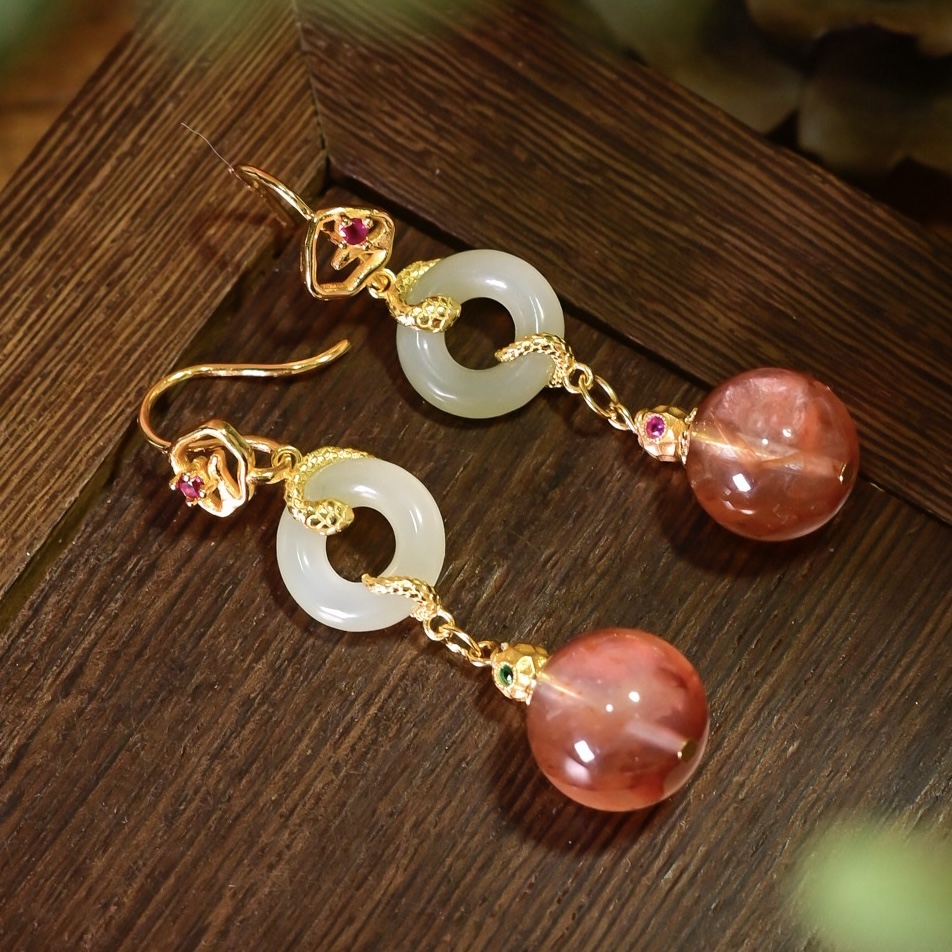 新中式天然和田玉甜甜圈耳环耳坠红胶花S925纯银镀金耳饰新年礼物