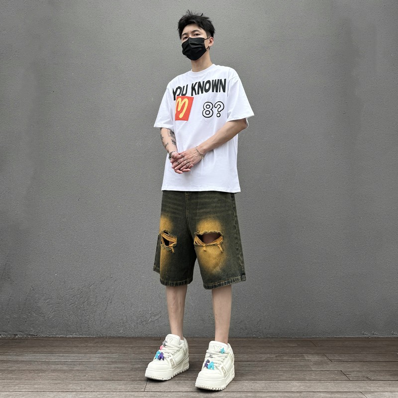 KISSNATE复古洗水做旧大破洞牛仔短裤男女街头宽松直筒阔腿七分裤