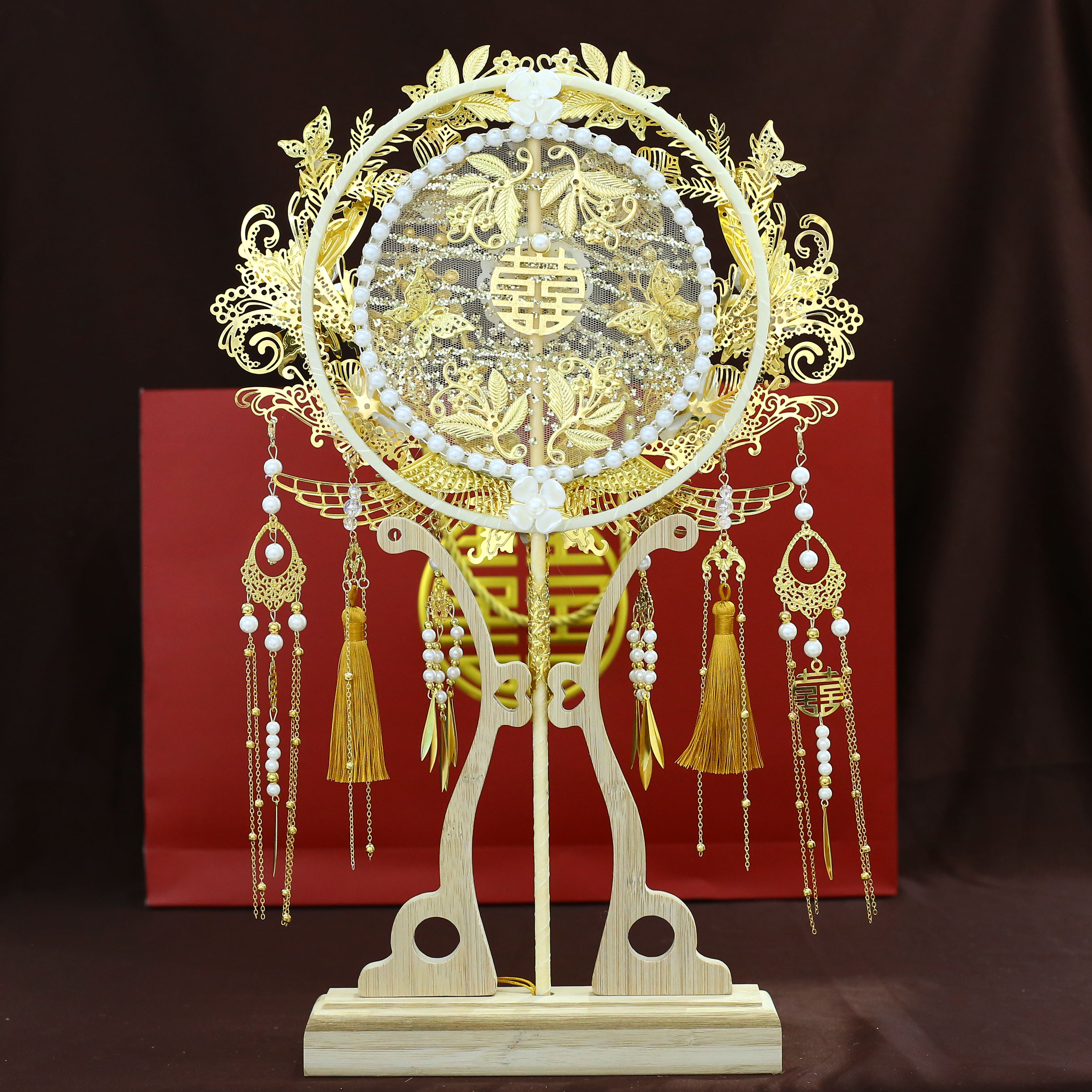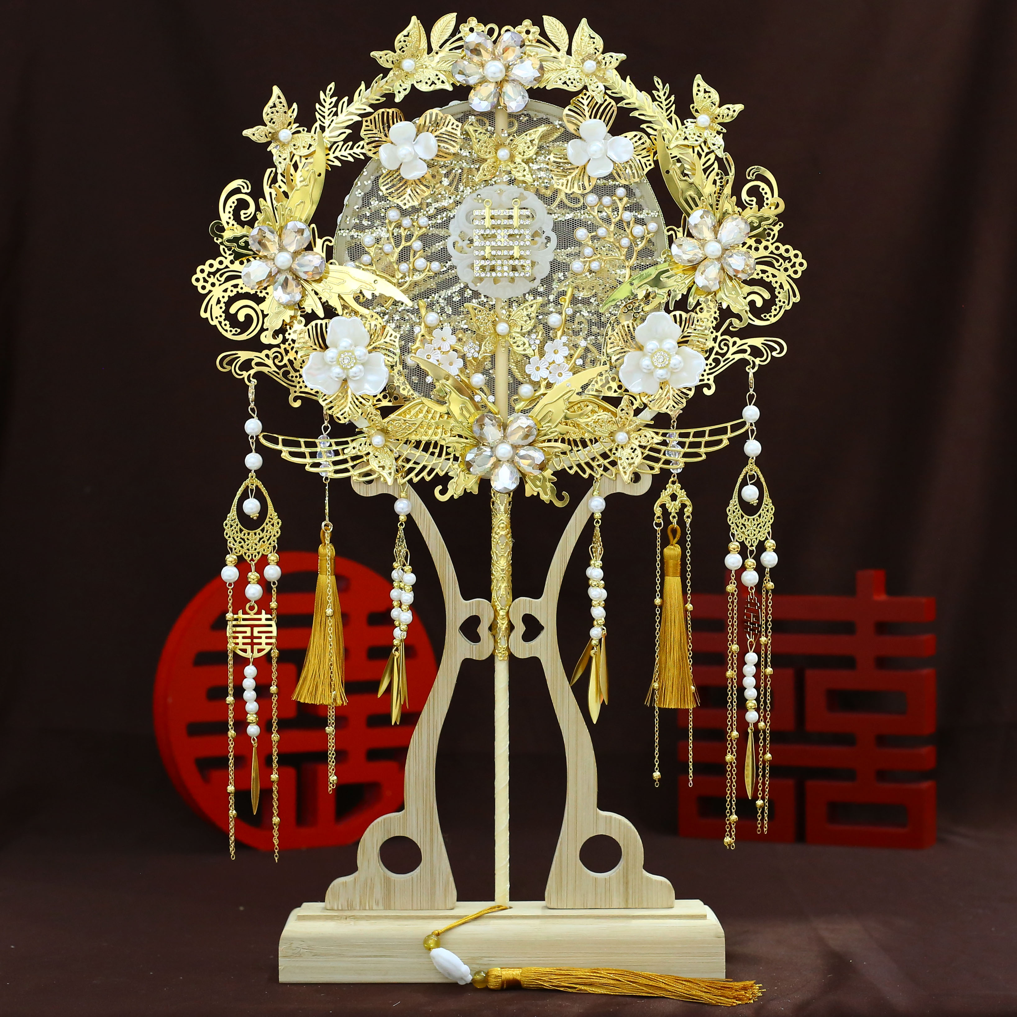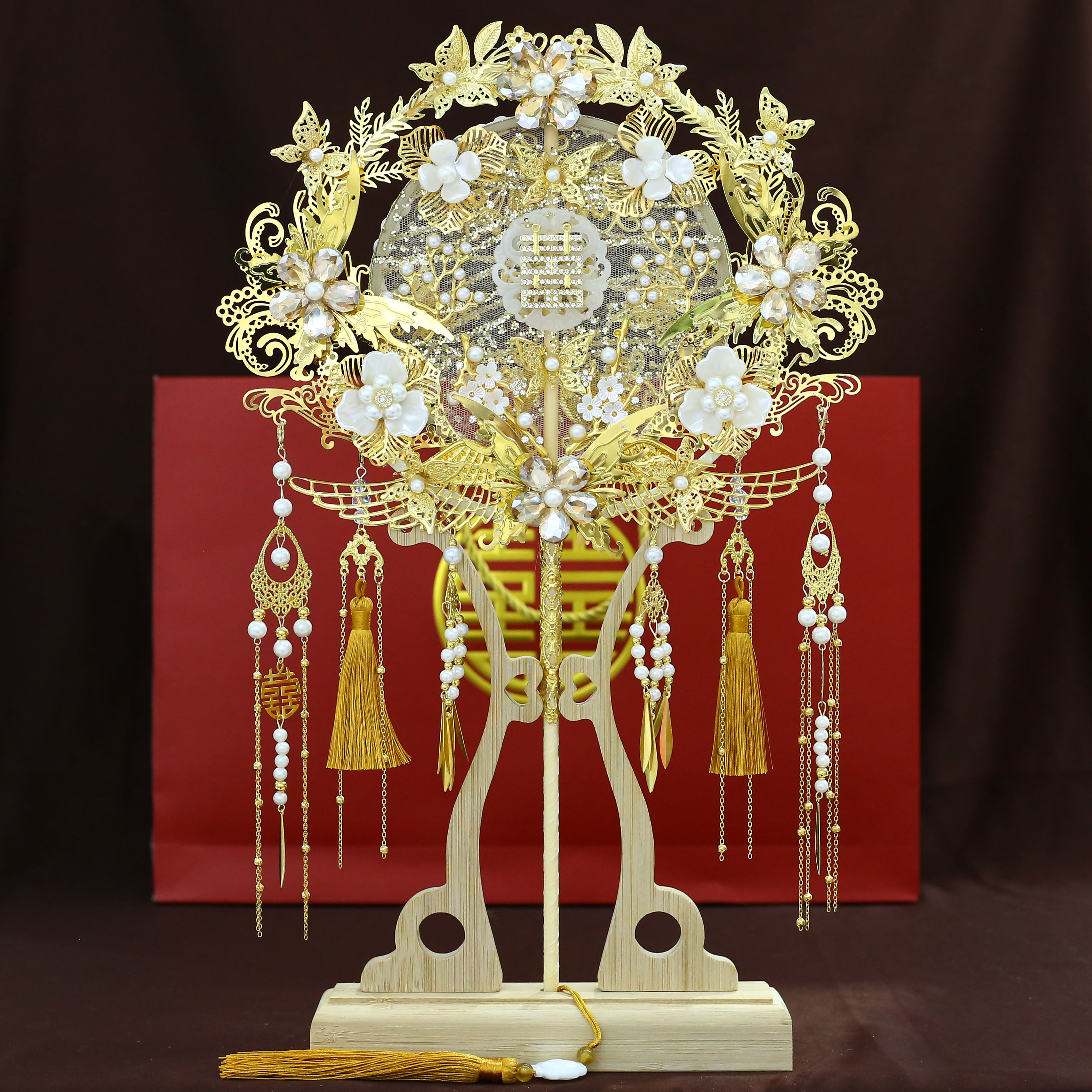香槟色团扇新娘结婚成品手工喜扇秀禾服中式混流遮面扇子9157金