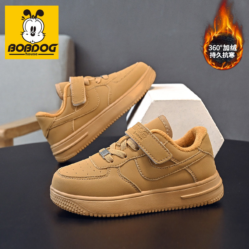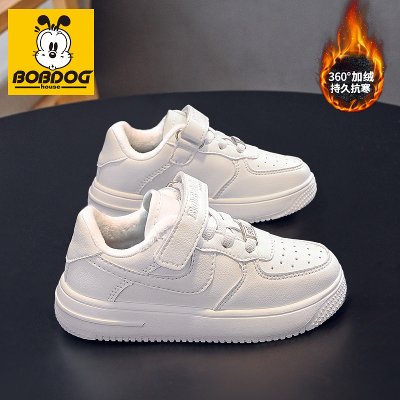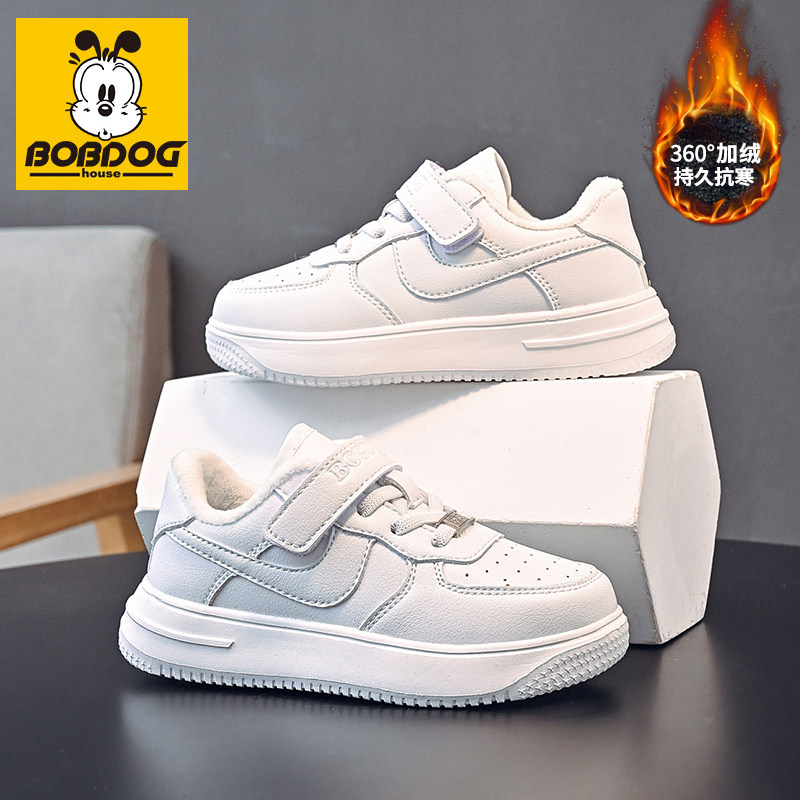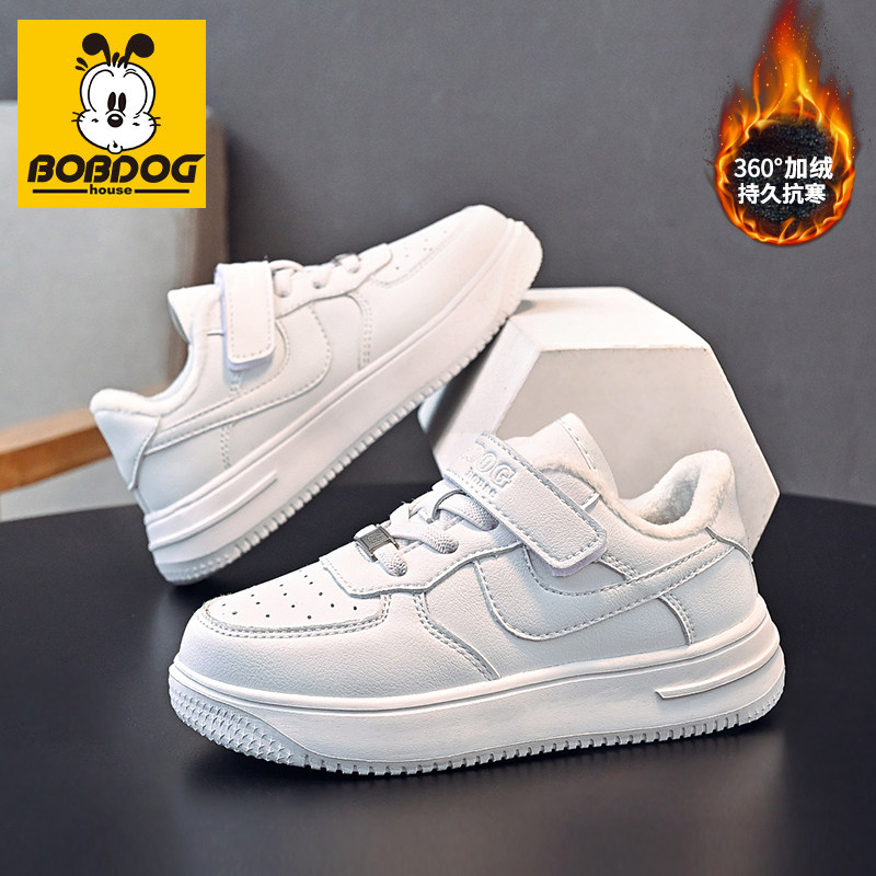 巴布豆男童板鞋2025秋冬新款加绒保暖小白鞋女童运动鞋皮面防水鞋