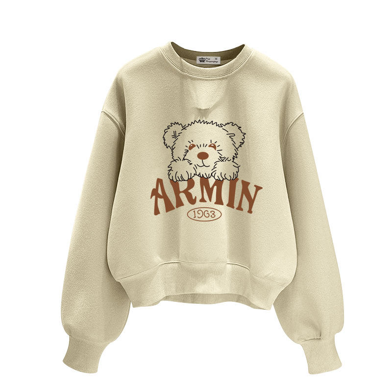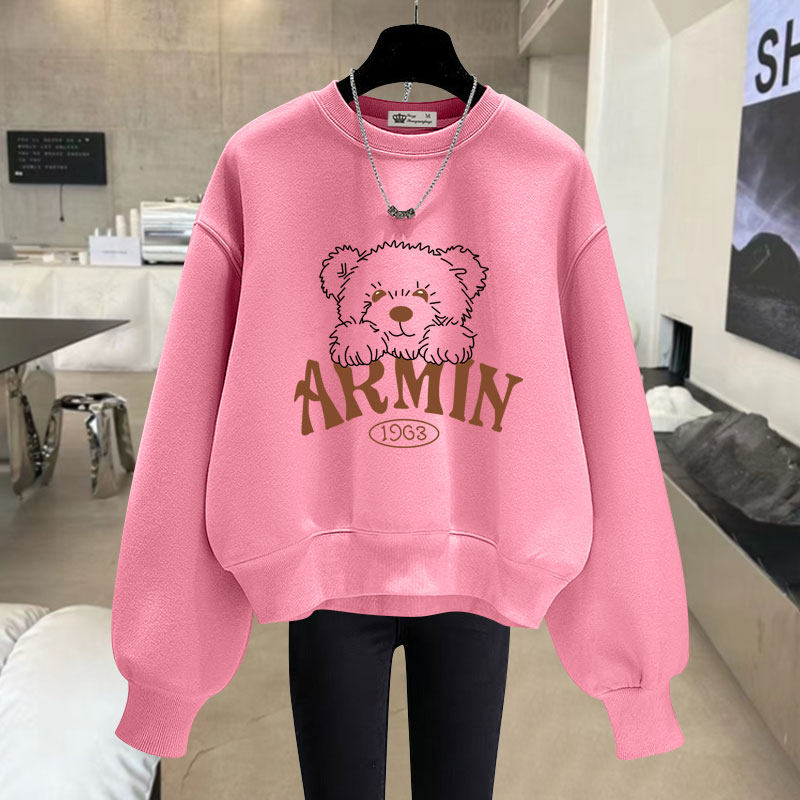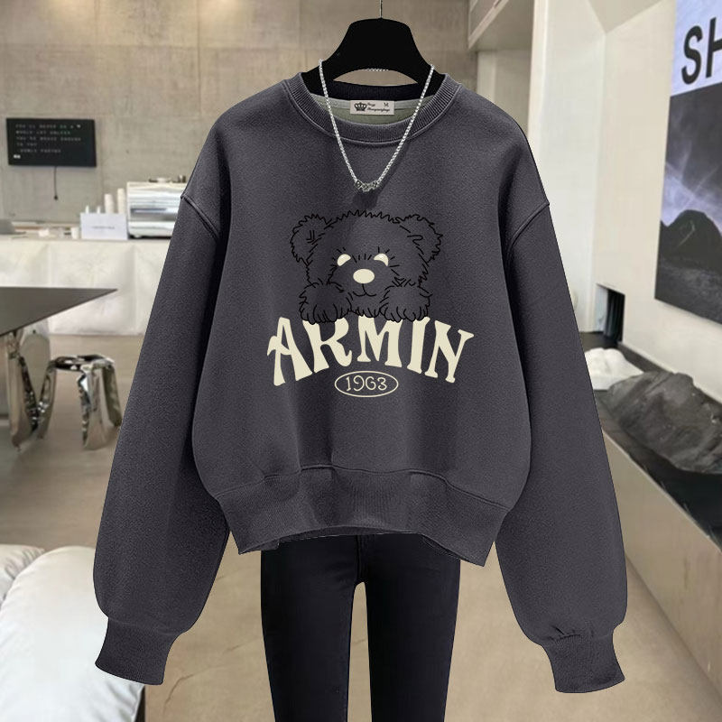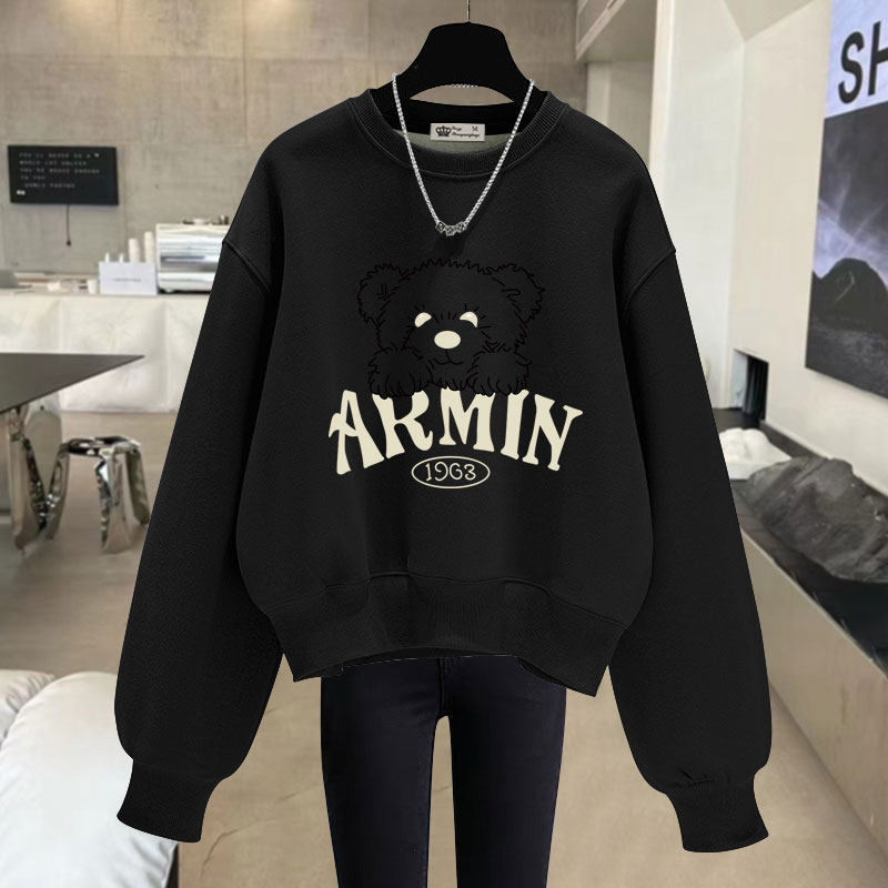 卡通字印花圆领短款卫衣女2025春秋冬新款宽松加绒加厚套头长袖潮