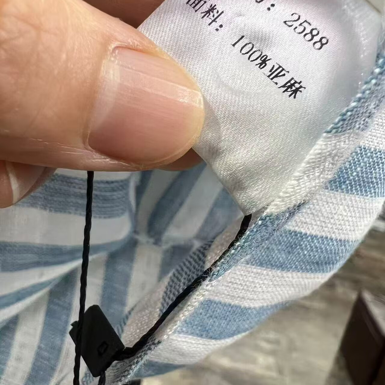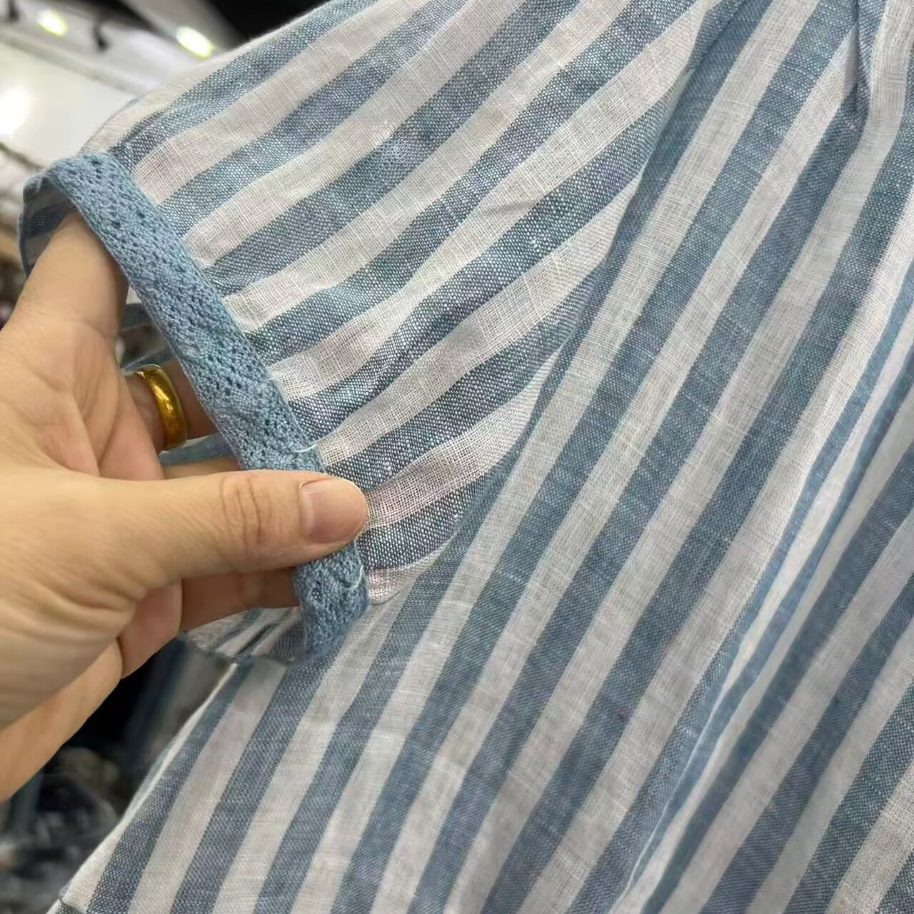 亚麻条纹短袖衬衣女夏季新款钩花拼接圆领宽松显瘦休闲上衣世0.13