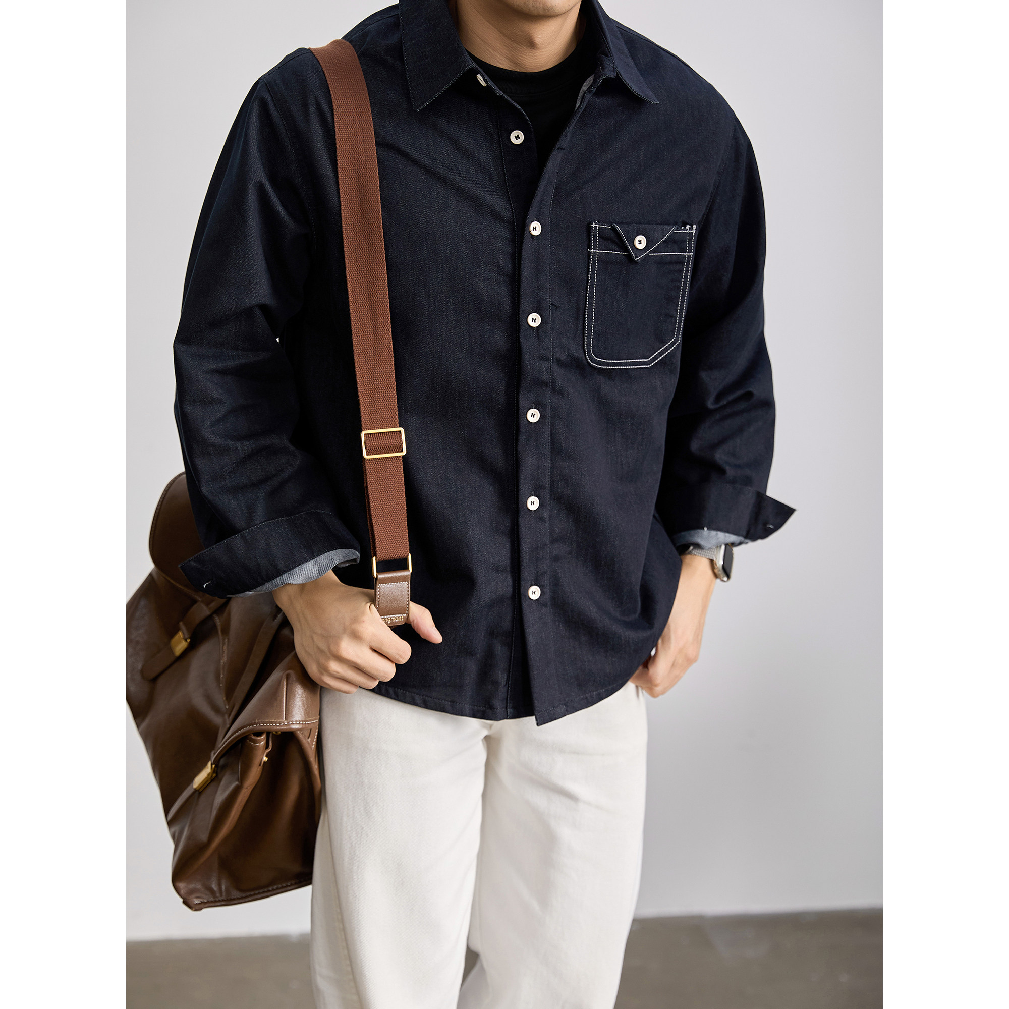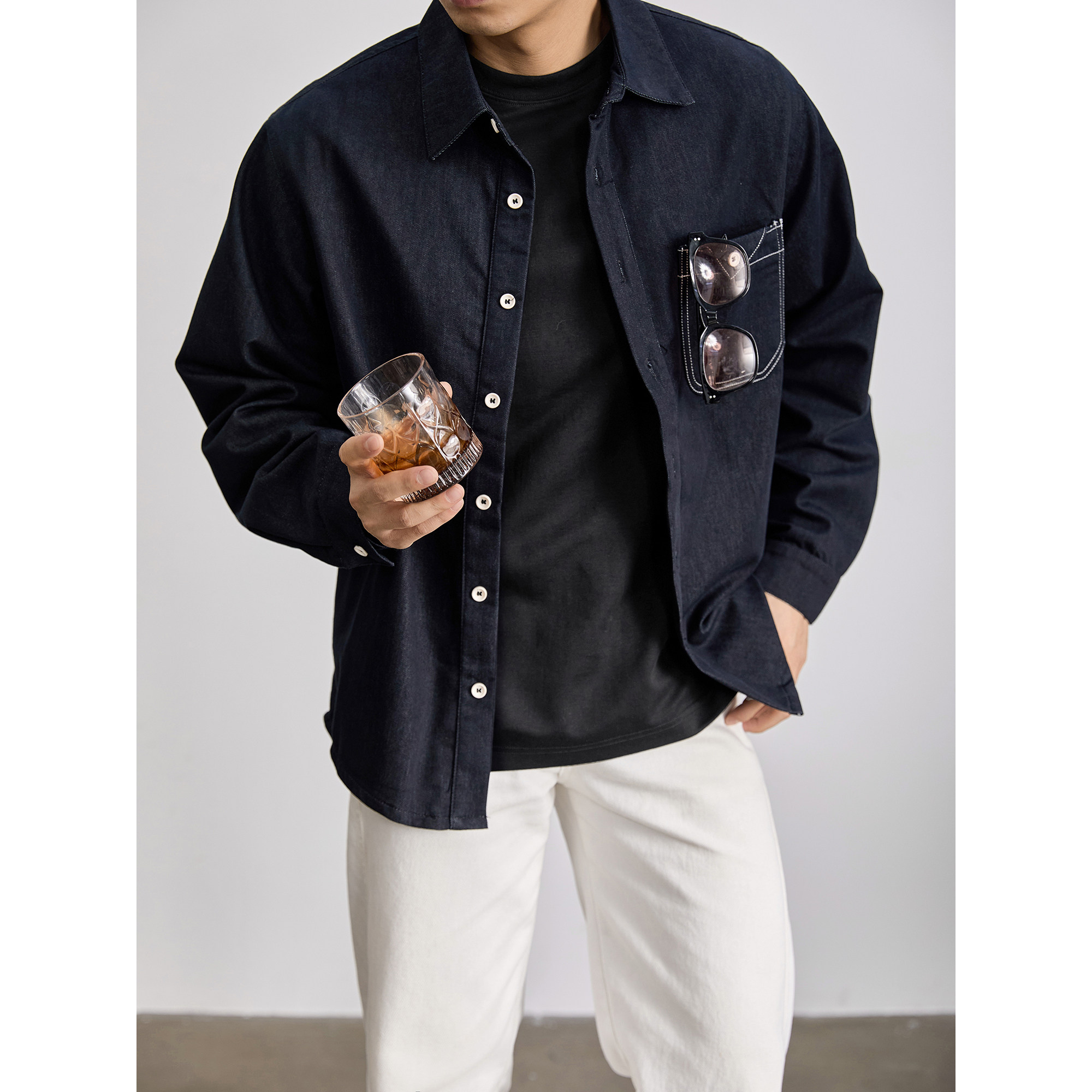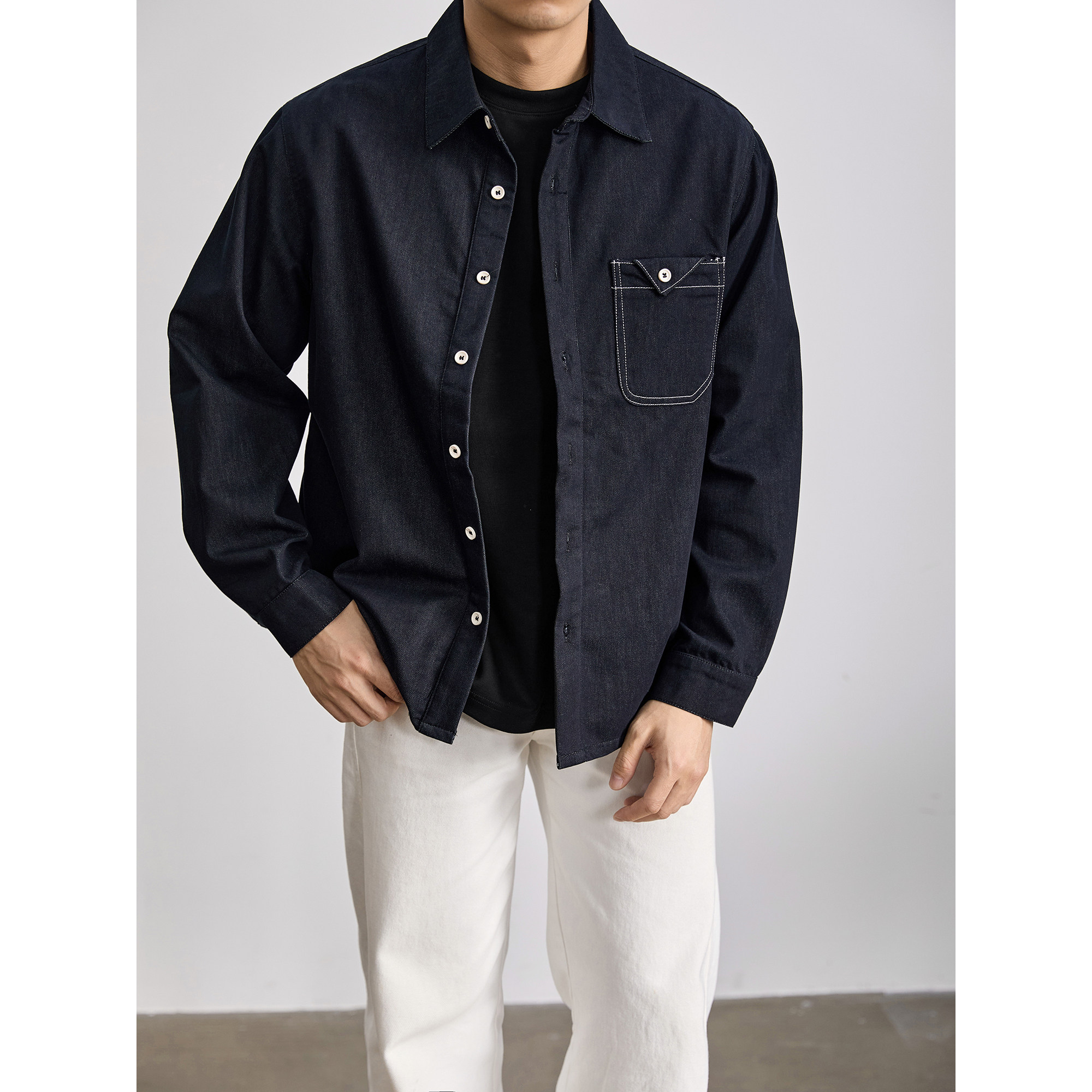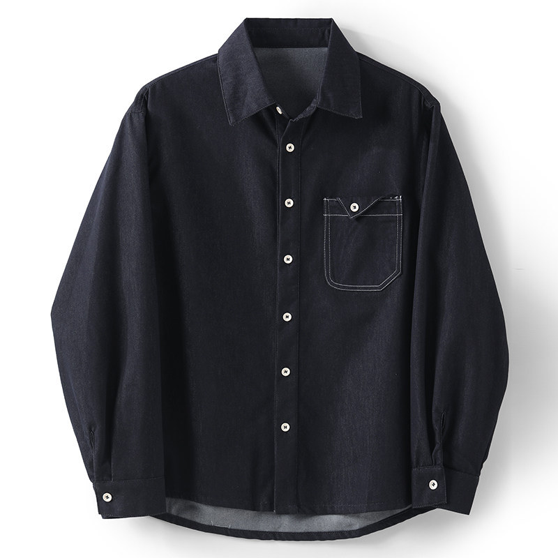 LUUD 潮流原色水洗丹宁牛仔外套男士春季辑明线三角贴袋长袖衬衫