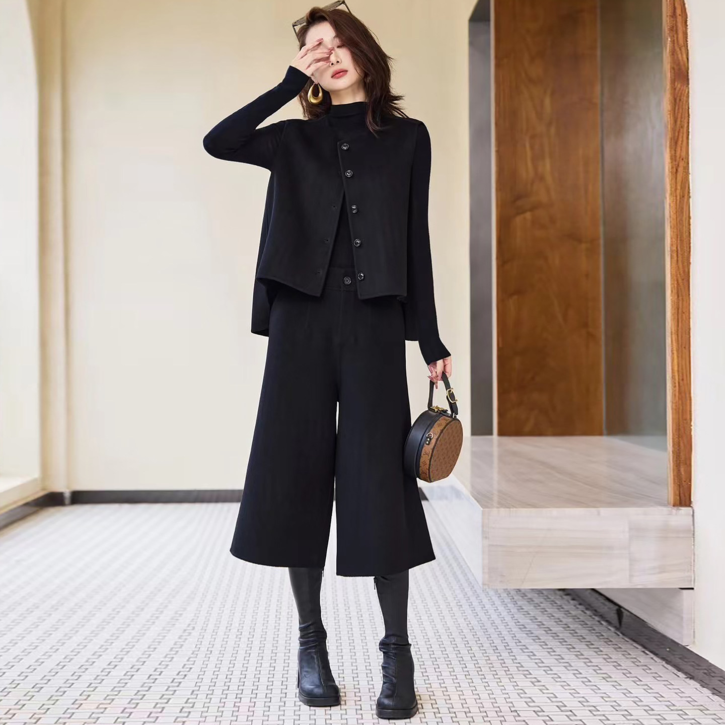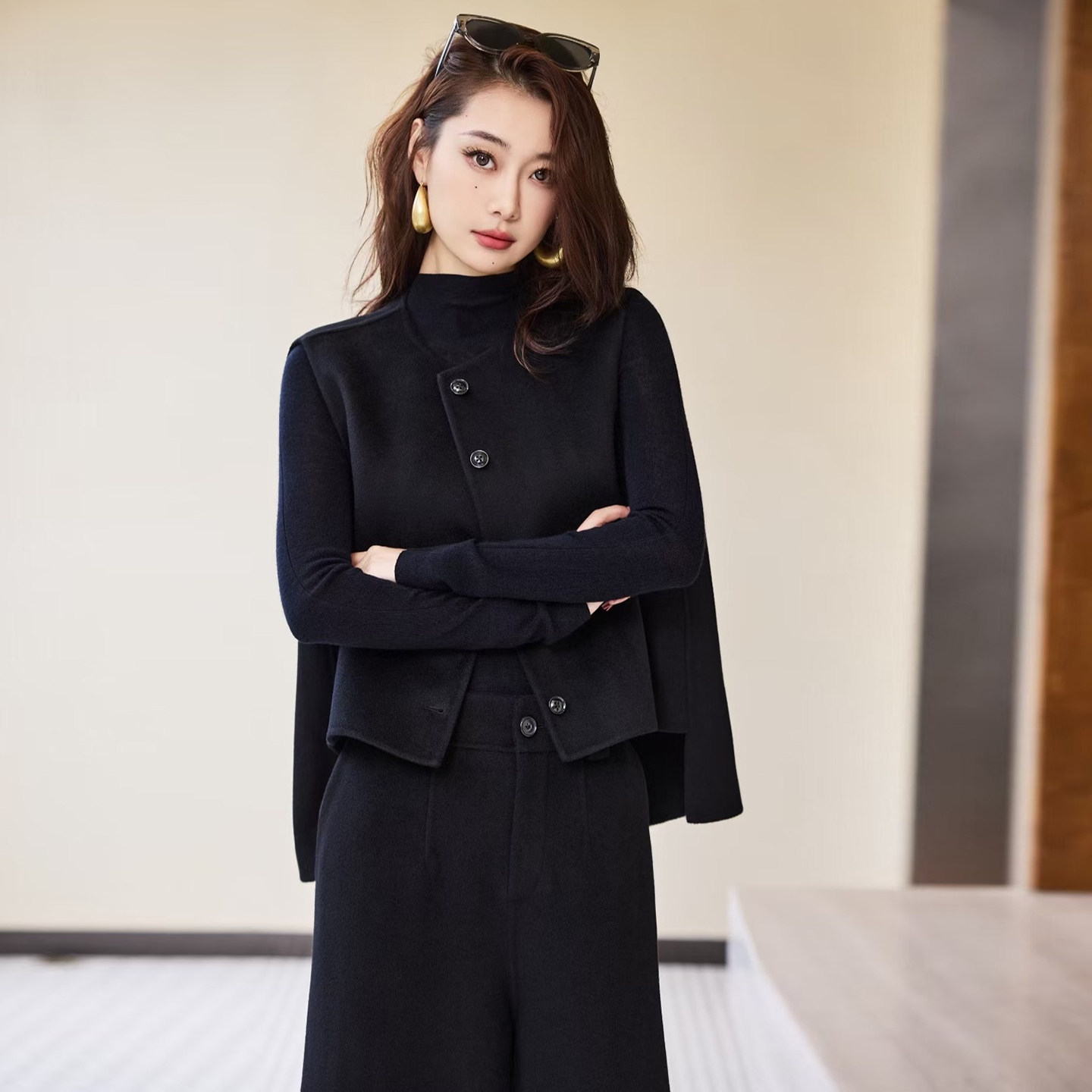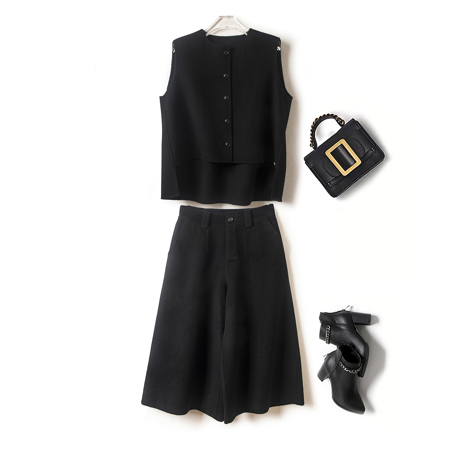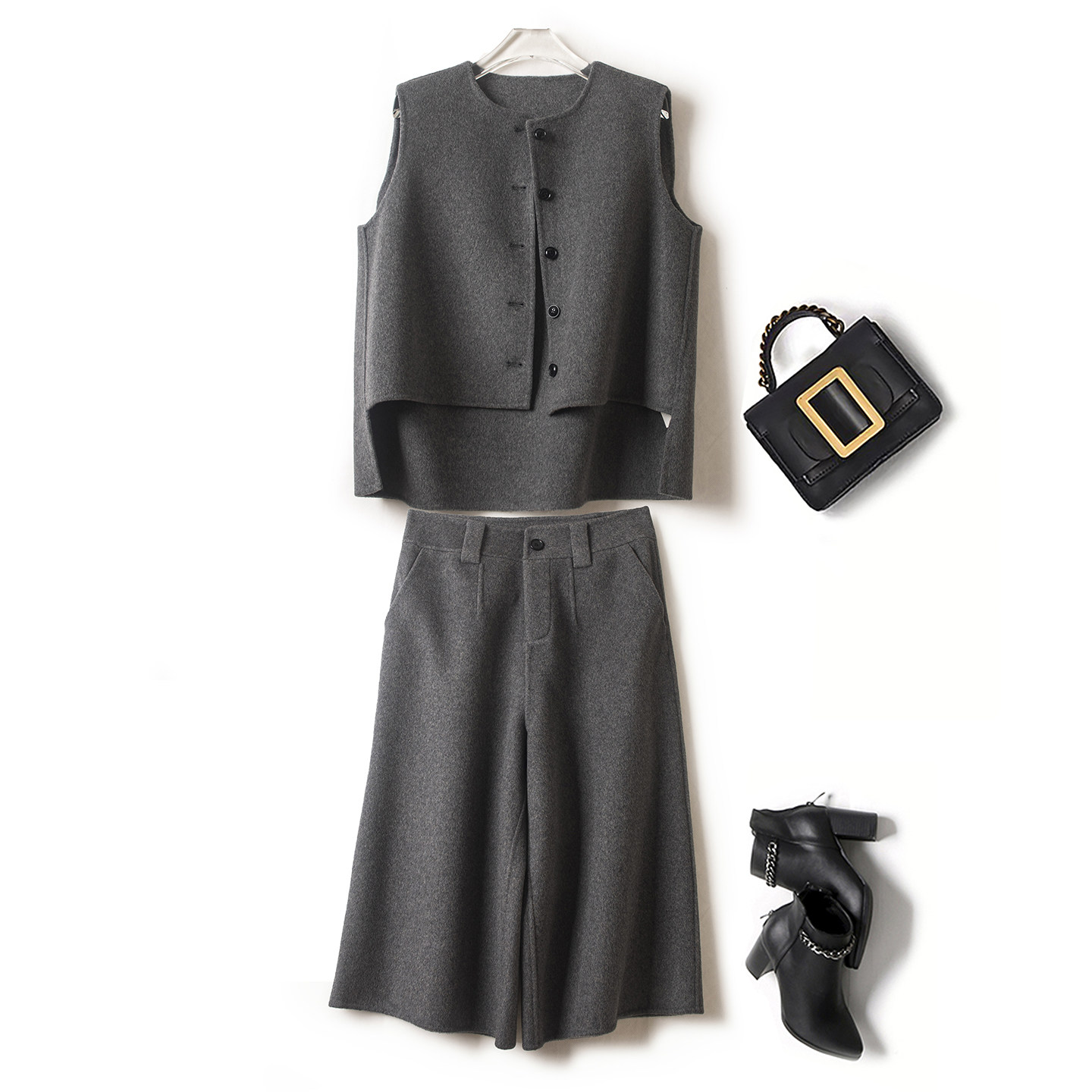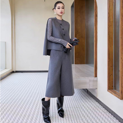 2025冬季新款妮子双面羊毛羊绒两件套装无袖上衣直筒阔腿七分裤女