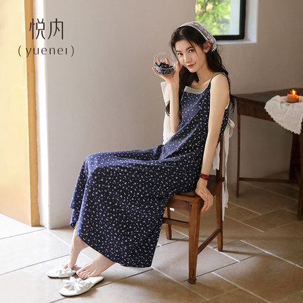 悦内带胸垫睡裙女款睡衣夏季夏天纯棉吊带背心碎花长款休闲可外穿