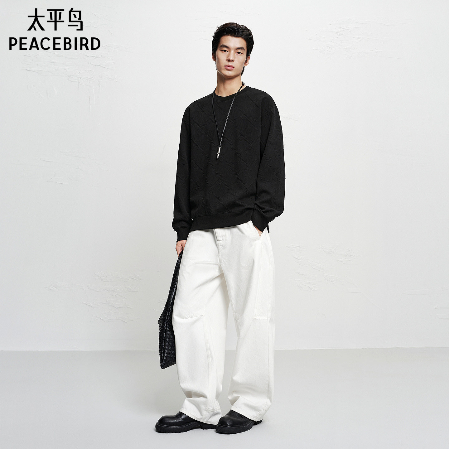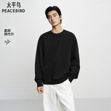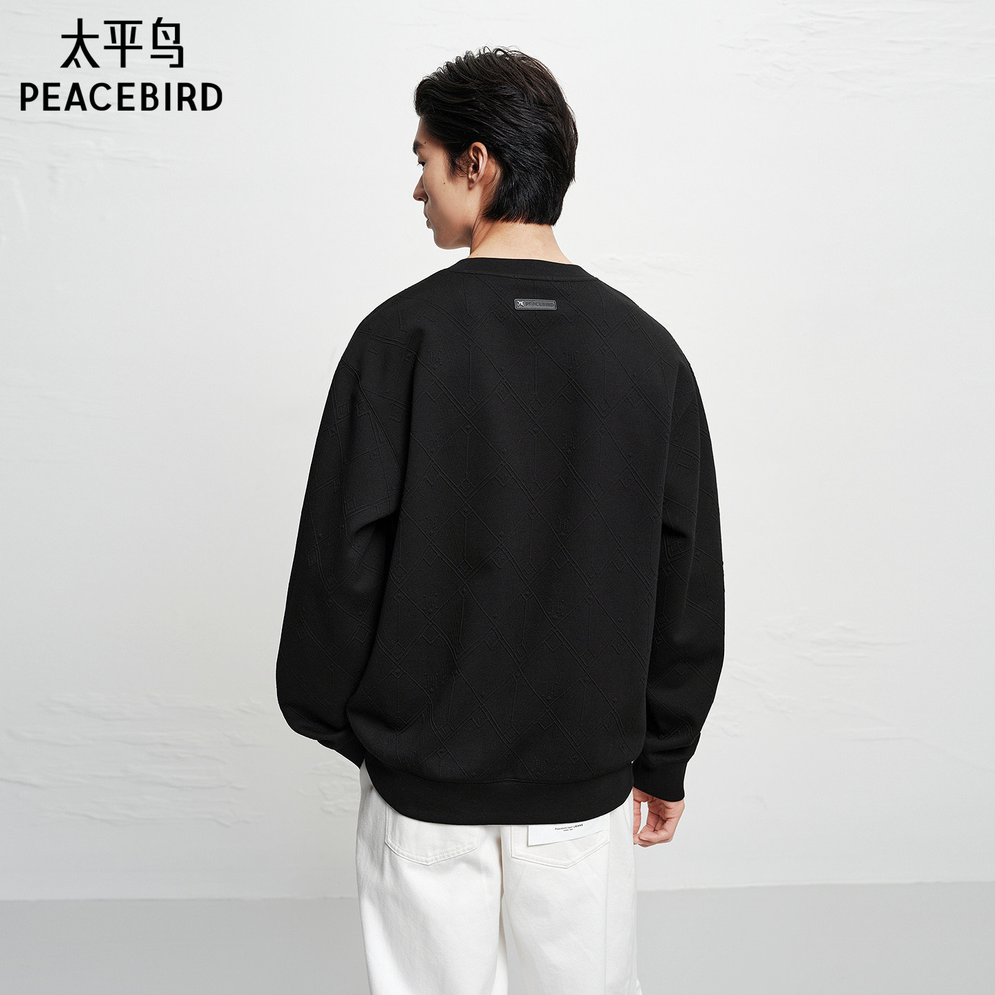 【商场同款】太平鸟男装 立体肌理提花黑色圆领套头卫衣B1CRF4270