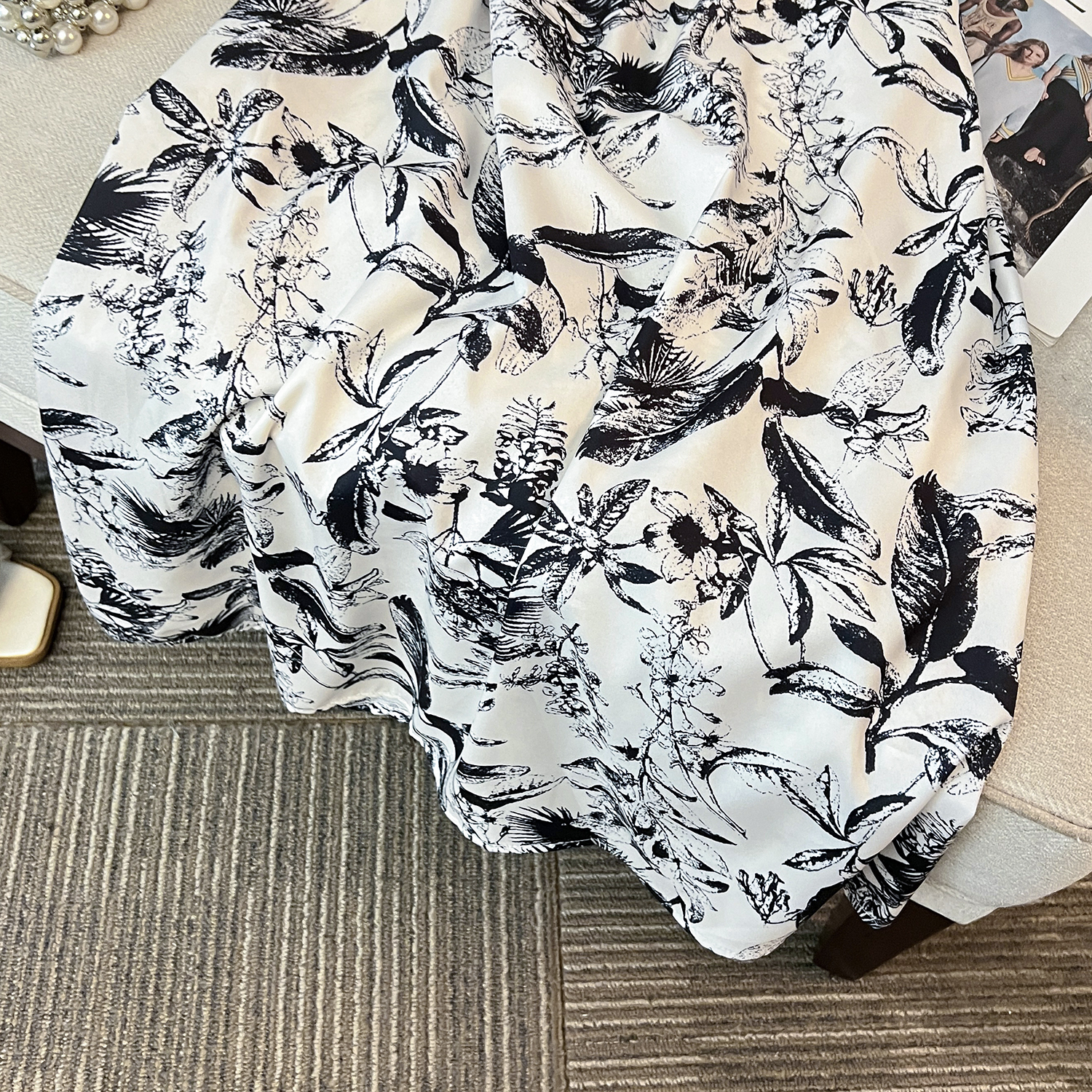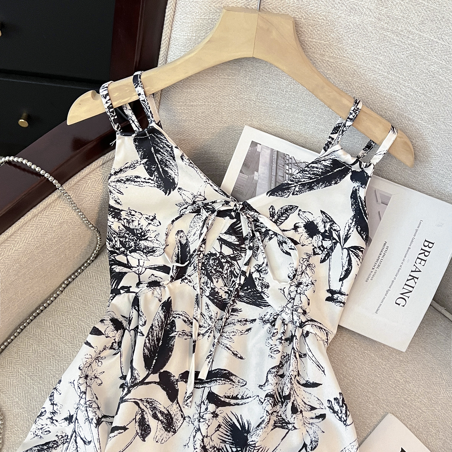 捡漏~水墨印花v领吊带连衣裙夏季女法式宽松慵懒风过膝长款碎花裙