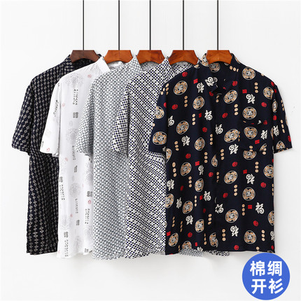 夏季男中老年棉绸立领开衫衬衫加大加肥人造棉短袖上衣T恤家居服