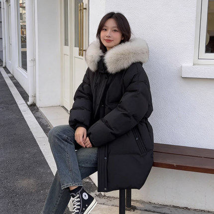大码胖mm黑色学院风连帽大毛领棉服女冬季加厚保暖宽松棉衣外套潮