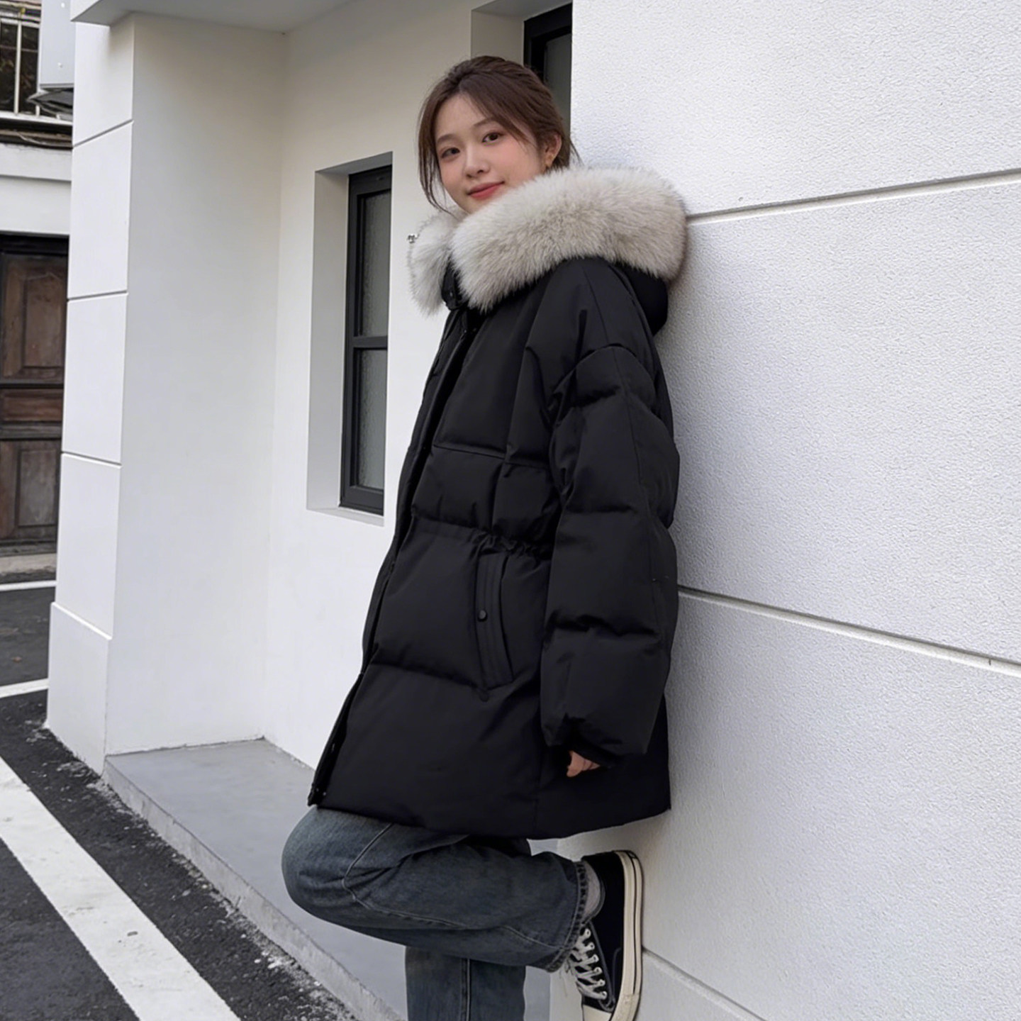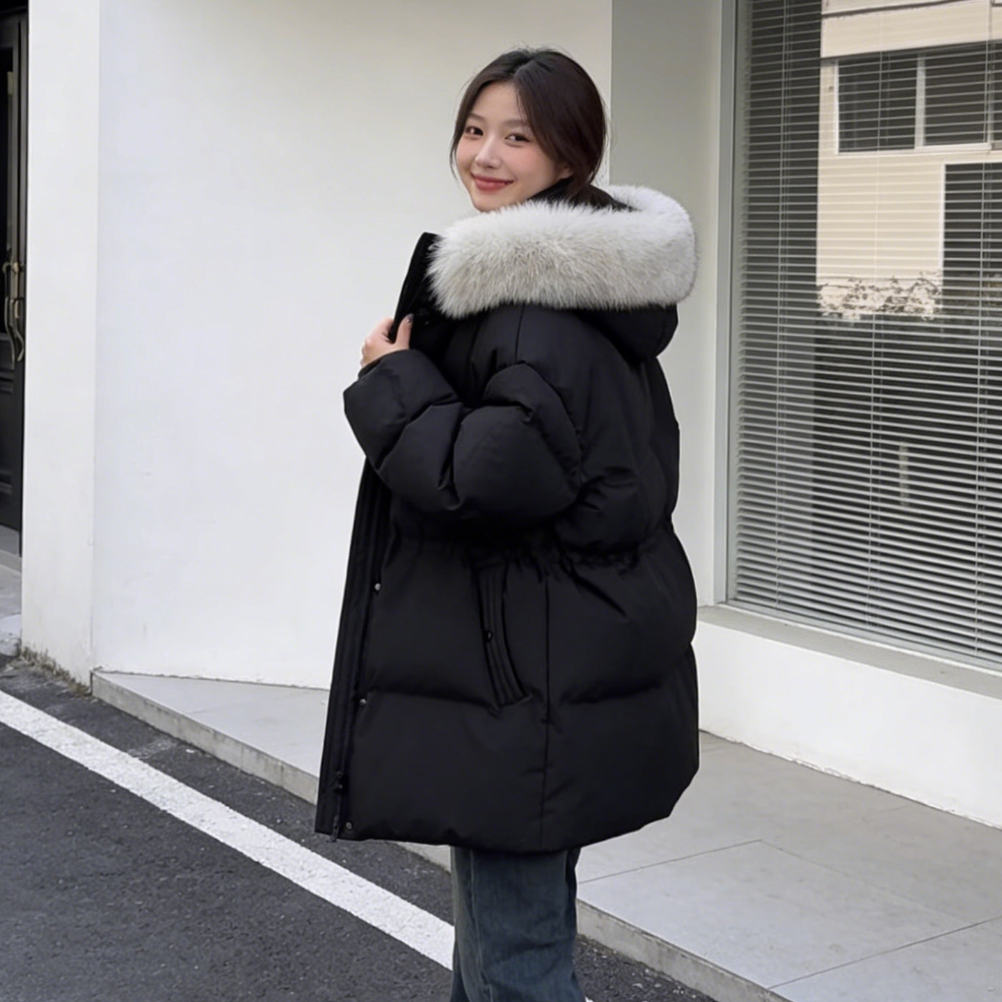 大码胖mm黑色连帽大毛领加厚棉衣