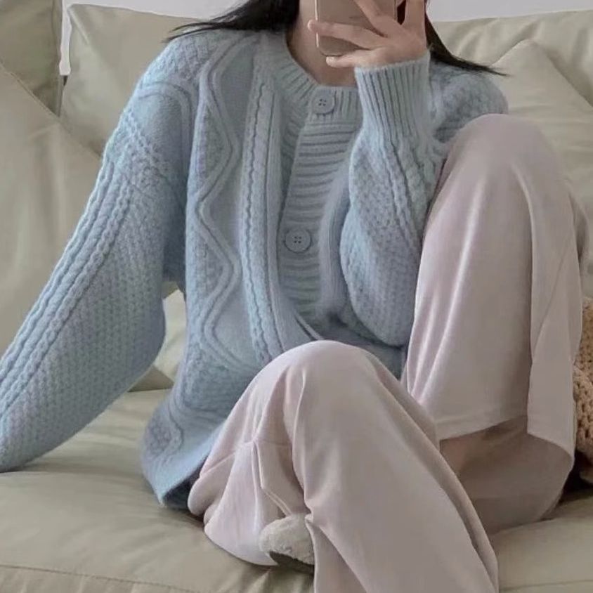 麻花针织开衫外套毛衣女秋冬内搭蓝色复古温柔爆款宽松外穿慵懒风