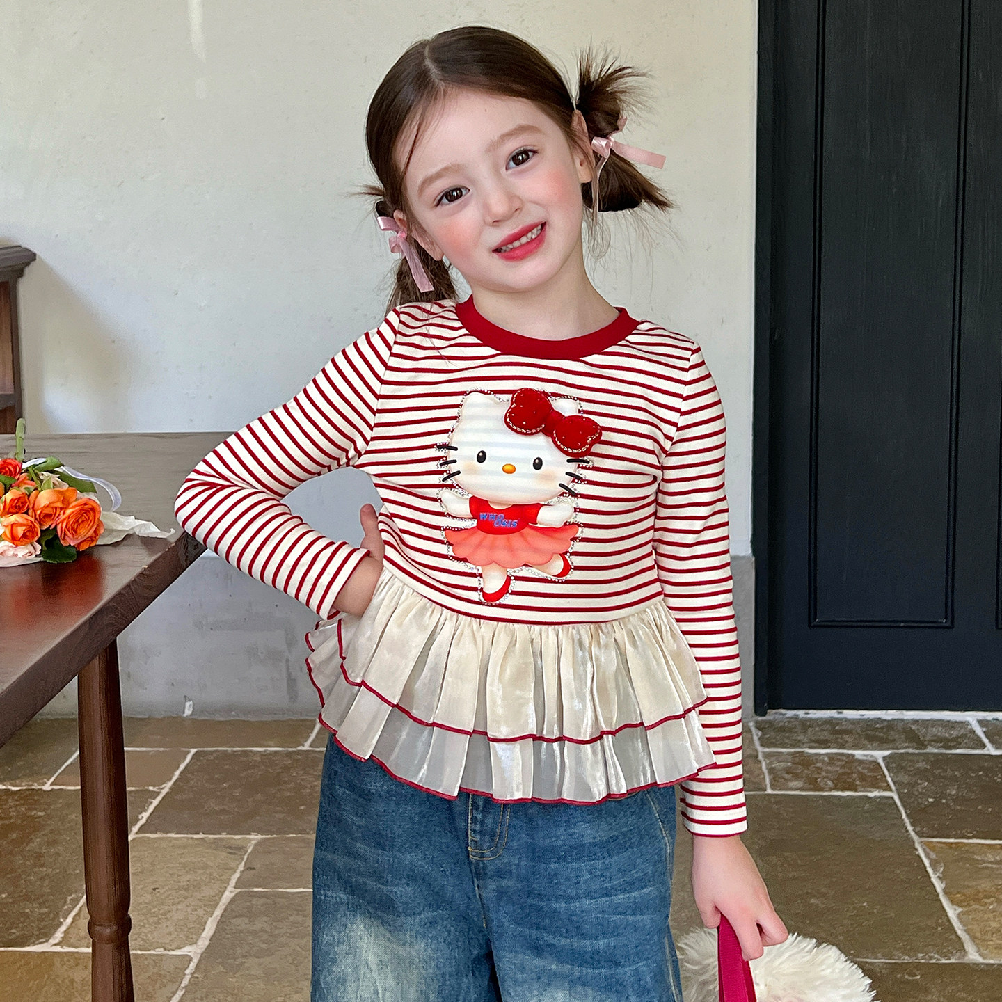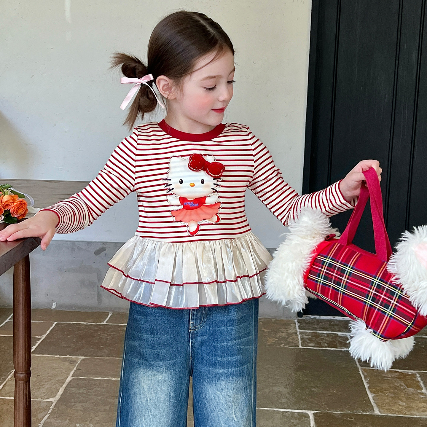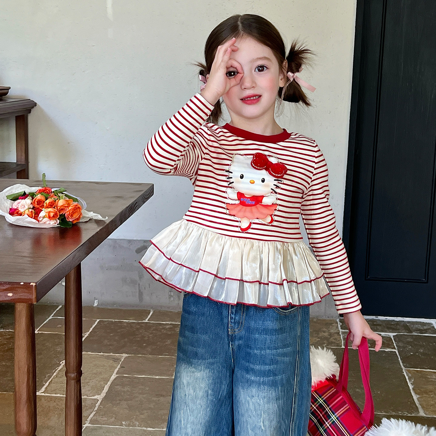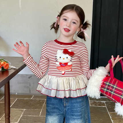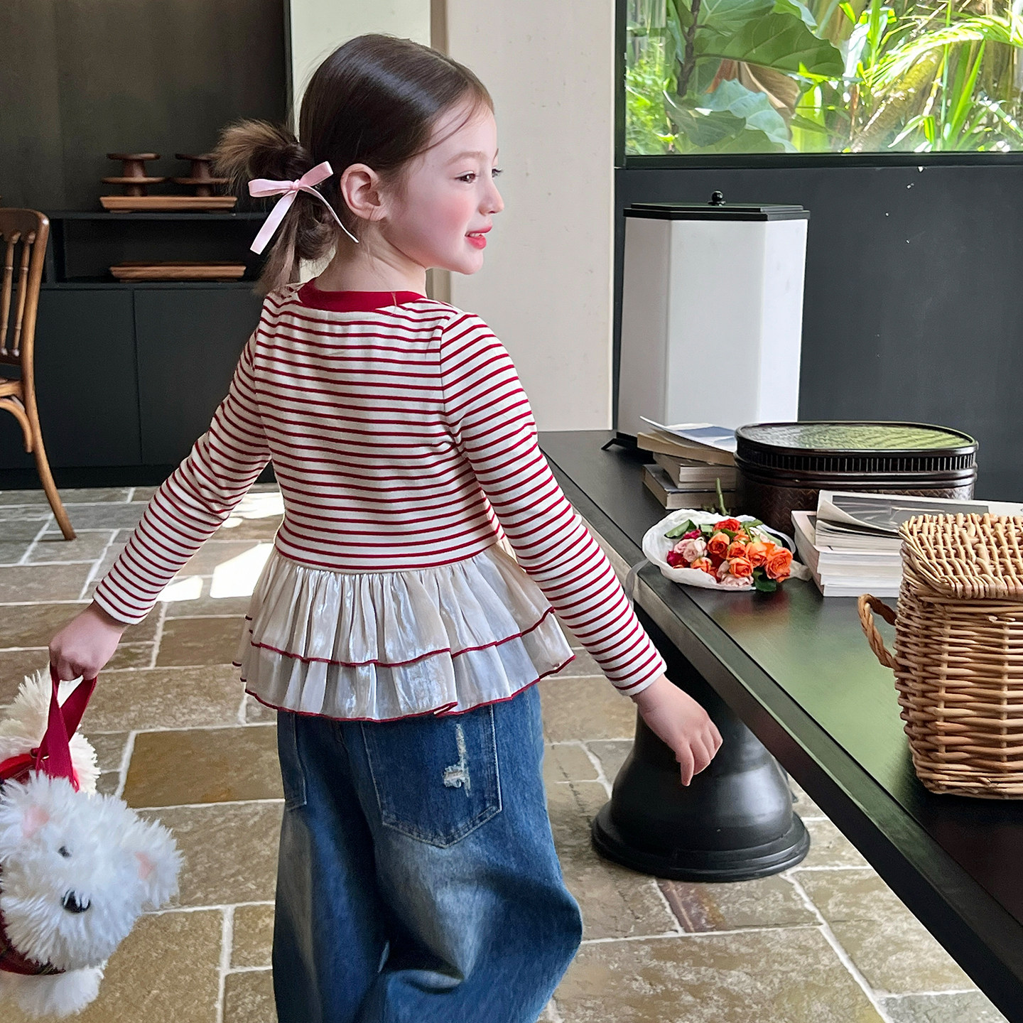 栀了成长记童装女童韩版条纹上衣秋季新款儿童宝宝荷叶边百搭T恤
