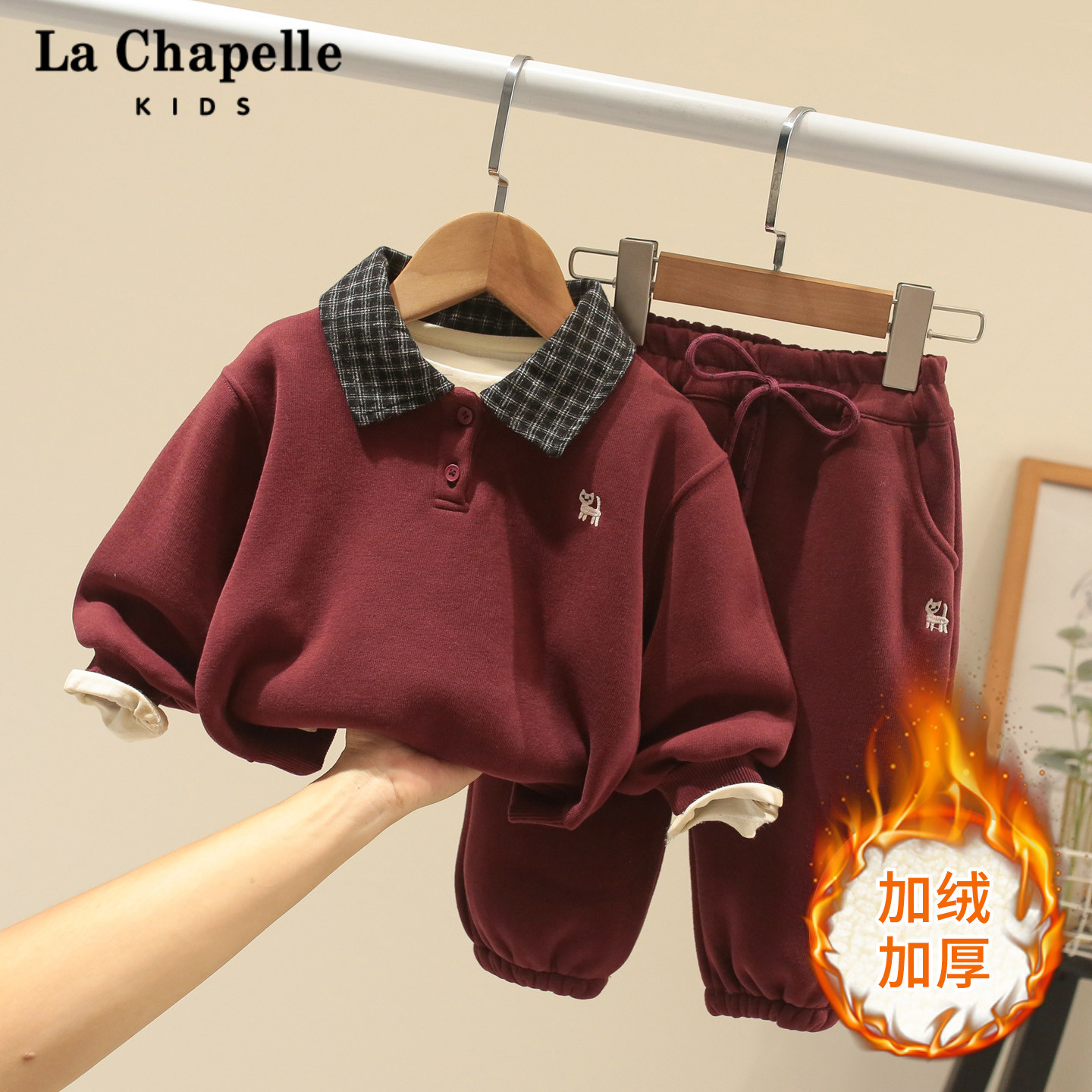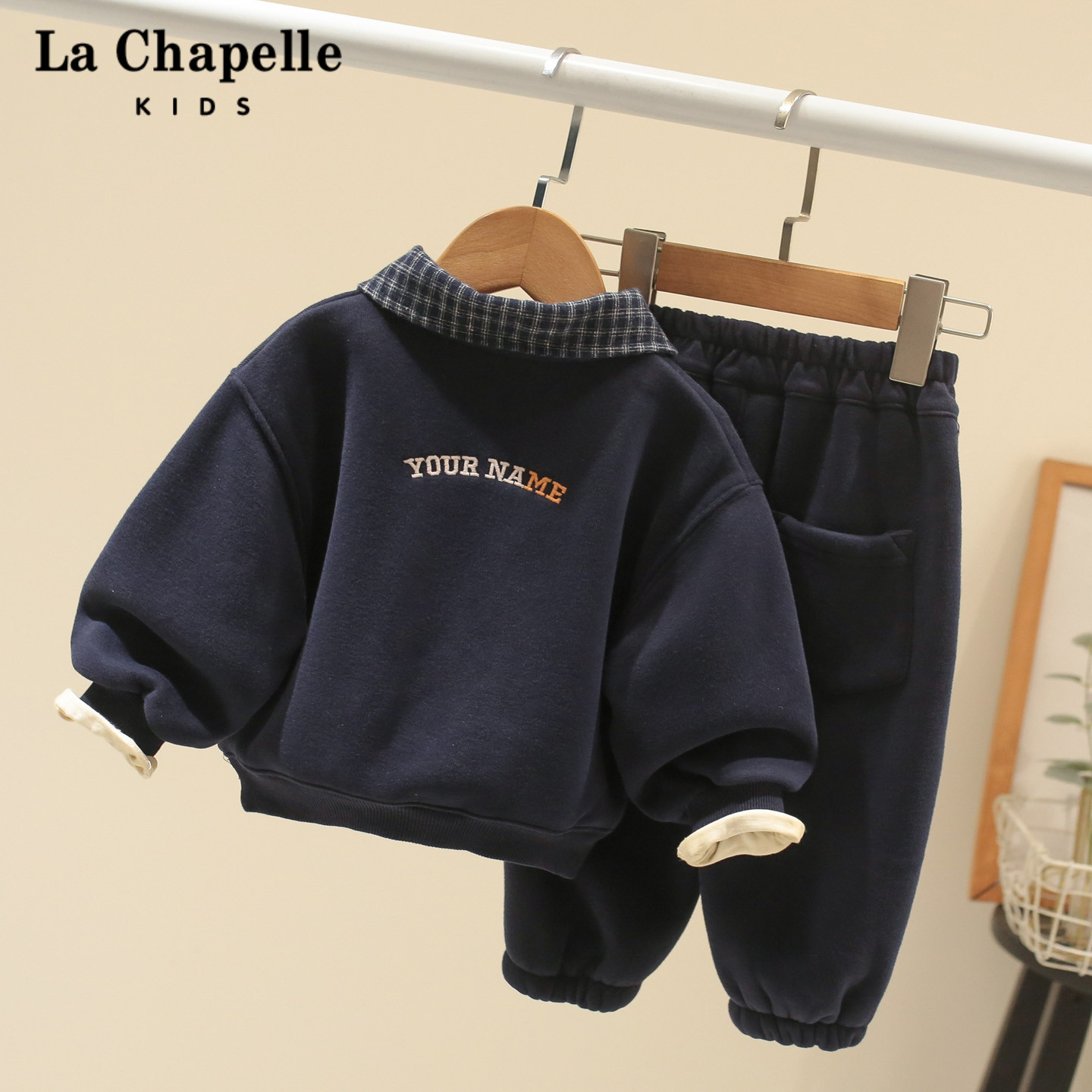 拉夏贝尔童装男童秋冬季套装加绒加厚卫衣裤子两件套儿童宝宝冬装