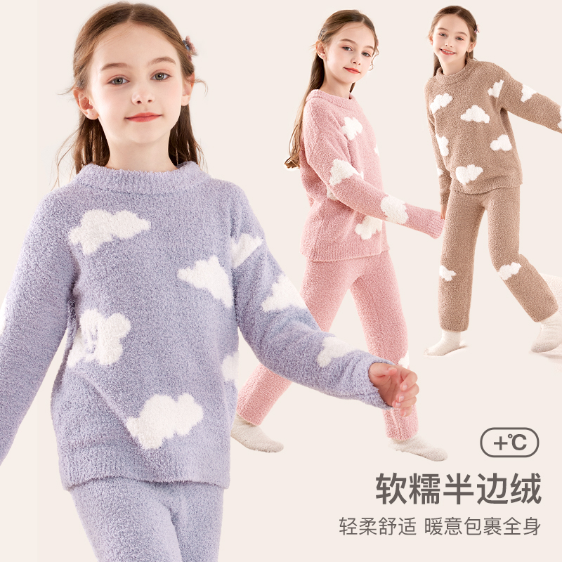 女童半边绒睡衣秋冬款儿童珊瑚绒加绒保暖家居服女孩大童亲子套装