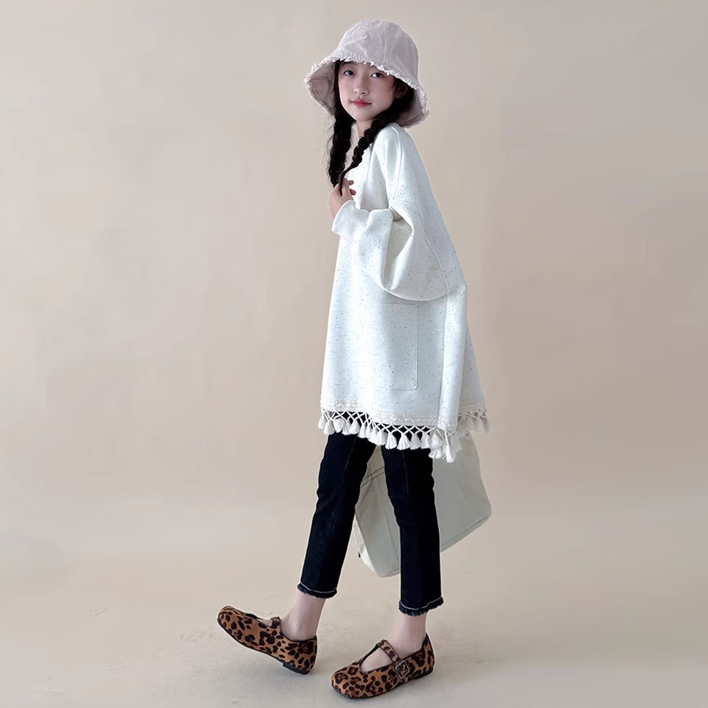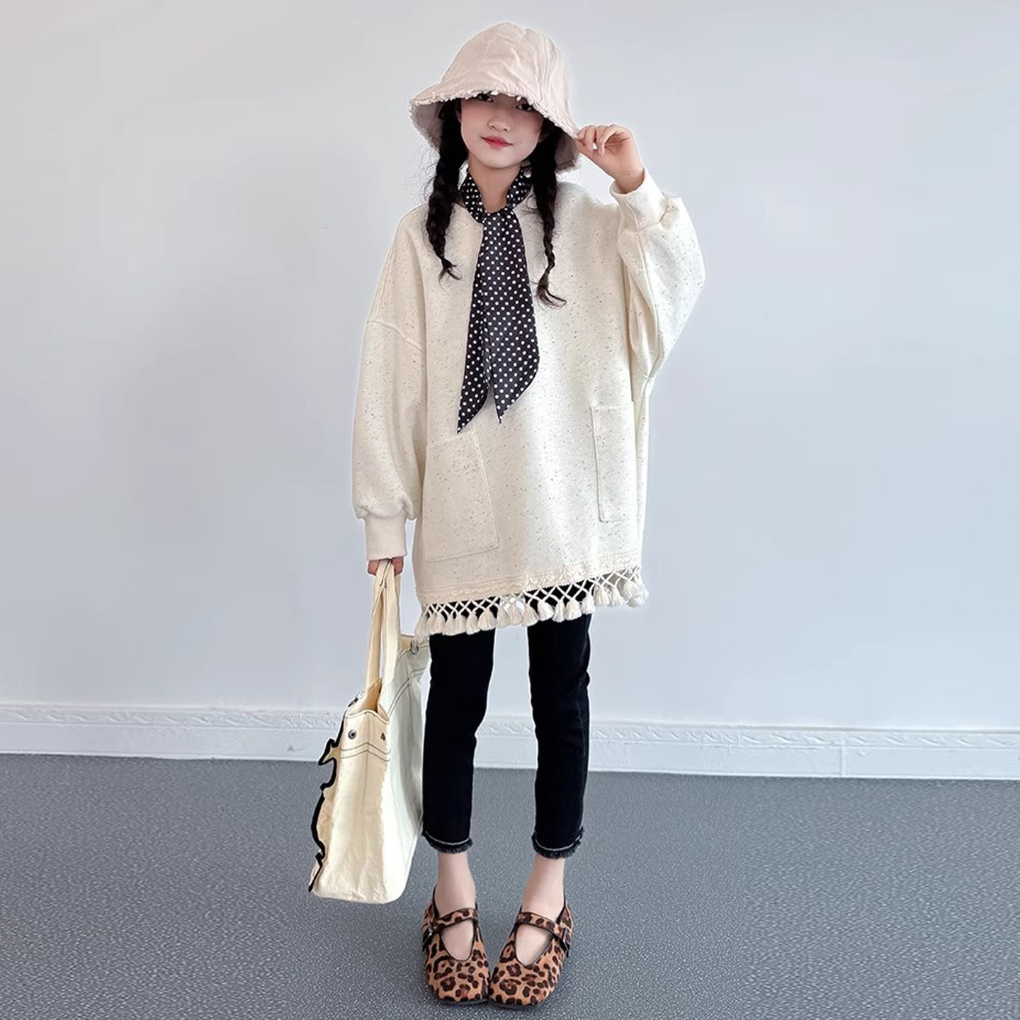 2025秋冬新款韩版蝙蝠袖加绒加厚碎边流苏卫衣女大童套头宽松针织