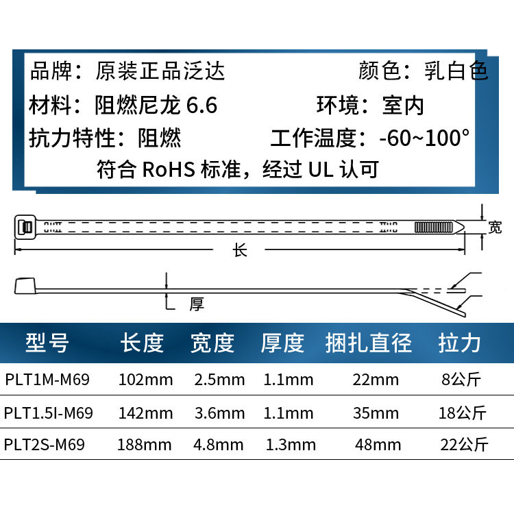 PANDUIT泛达美国进口原装PLT1.5I-M69尼龙扎带阻燃V0耐高温束线带